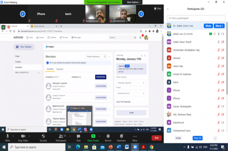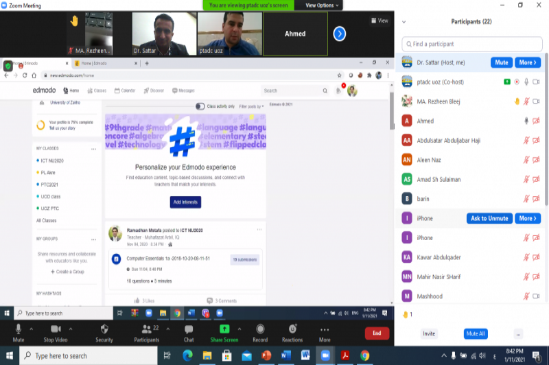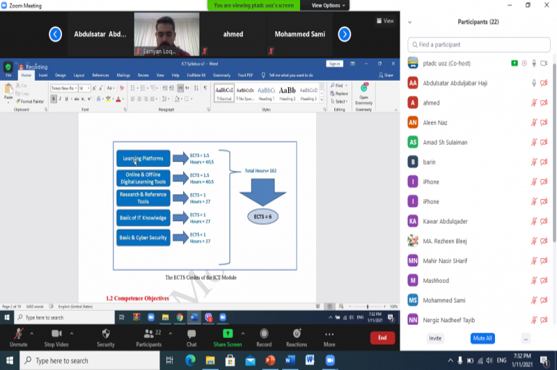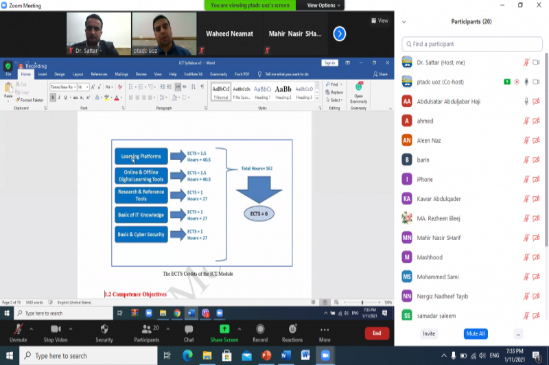 On Monday, January 11, 2021, at 7:00 pm, the Pedagogy and Academic Training Center started its pedagogical training course ( Round Three). At the beginning of the course, Dr. Satar J. Haji- Director of the center welcomed the participants and explained health regulations for them then the participants and lecturers of the course introduced themselves for each other.