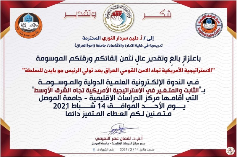 شاركت التدريسية بكلية الإدارة والاقتصاد دلين سردار النوري في الندوة الإلكترونية الدولية التي أقامها مركز الدراسات الإقليمية في جامعة الموصل يوم الأحد 14/2/2021 تحت عنوان: (الثابت والمتغير في الاستراتيجية الأمريكية تجاه الشرق الأوسط).