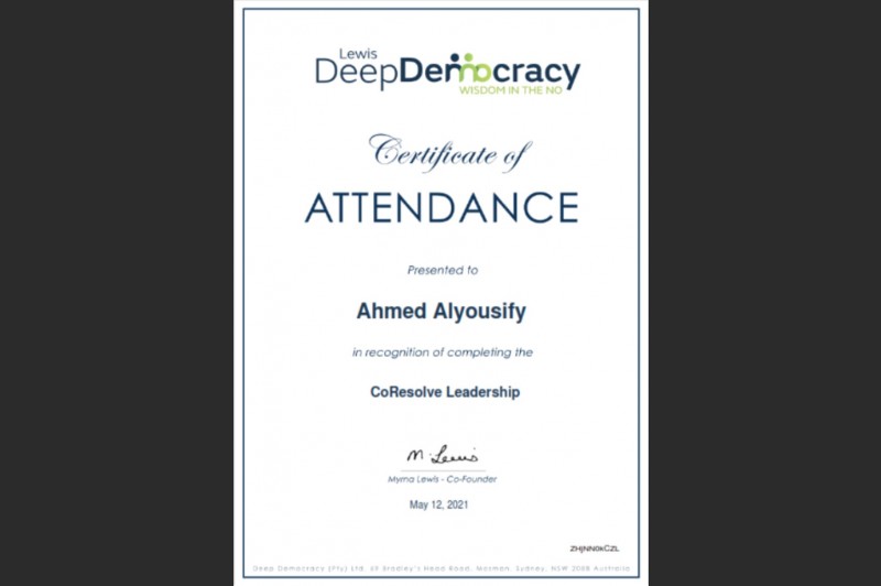 It’s worth mentioning that Mr. Ahmed Alyousify, received a Lewis Deep Democracy Co-Resolve Leadership Program certificate for completing the course.