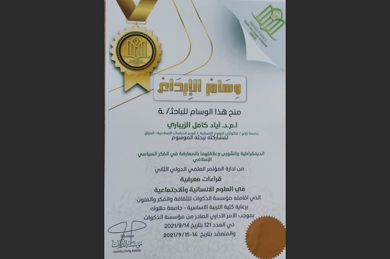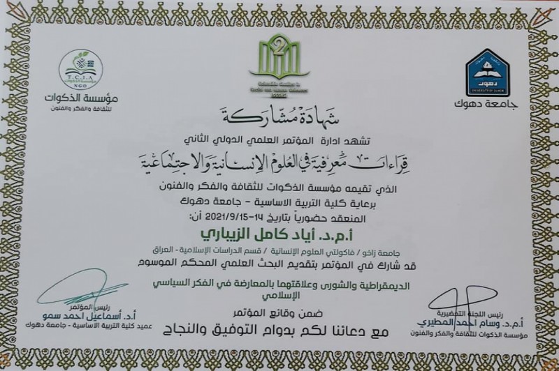 شارك الأستاذ المساعد الدكتور أياد كامل التدريسي بقسم الدراسات الإسلامية بجامعة زاخو في المؤتمر العلمي الدولي الذي أقامته جامعة دهوك بالتعاون مع مؤسسة الذكوات للثقافة والفكر والفنون يومي 14 و 15 من الشهر الجاري تحت عنوان: (قراءات معرفية في العلوم الإنسانية والاجتماعية).