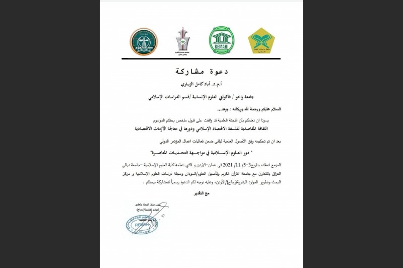 حيث شارك في الجلسة الثالثة بتقديم بحث تحت عنوان: (الثقافة المقاصدية لفلسفة الاقتصاد الٳسلامي ودورها في معالجة الٲزمات الاقتصادية).