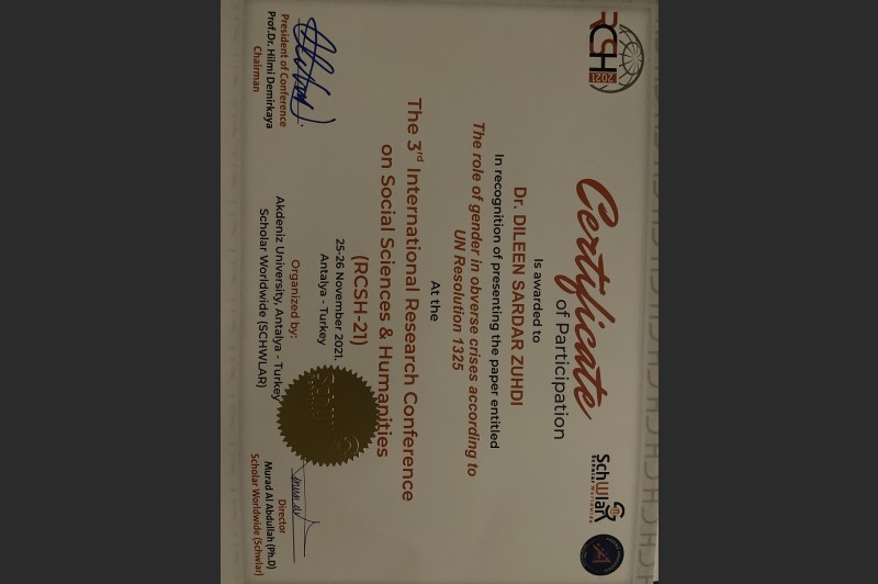 ل ڕۆژا پێنجشه‌مبێ ڕێكه‌ڤتى 25/11/2021 ماموستایا زانكۆیا زاخۆ (م.دلین سردار النوری) ماموستا ل كۆلیژا كارگێرى و ئابوورى و ئه‌نداما لیژنه‌یا ئاماده‌كار و ئاخڤتنكه‌ر پشكداربوو د سێیه‌مین كۆنفرانسێ نیڤده‌وله‌تیدا لژێر ناڤونیشانێ (زانستێن جڤاكى و مرۆڤایه‌تى)ئه‌وا كو هاتییه‌ رێكخستن ژلایێ ناڤه‌ندا ڤه‌كۆلینێن په‌روه‌رده‌یى یا جیهانێ (Schwlar worldwide Educational ) بهڤارى لگه‌ل زانكۆیا ئاك ده‌نیز ل ئه‌نتالیا. هه‌ژییه‌ بێژین ، كو مژارێن كۆنفرانسى گرێداى ب توندوتیژییا لسه‌ر ژنێ دهێته‌ كرن و سه‌رنج كێشا سه‌ر پشكداربوونا ژنێ د بریاراندا و ئاشتییا وێ.