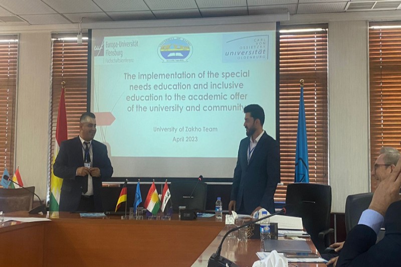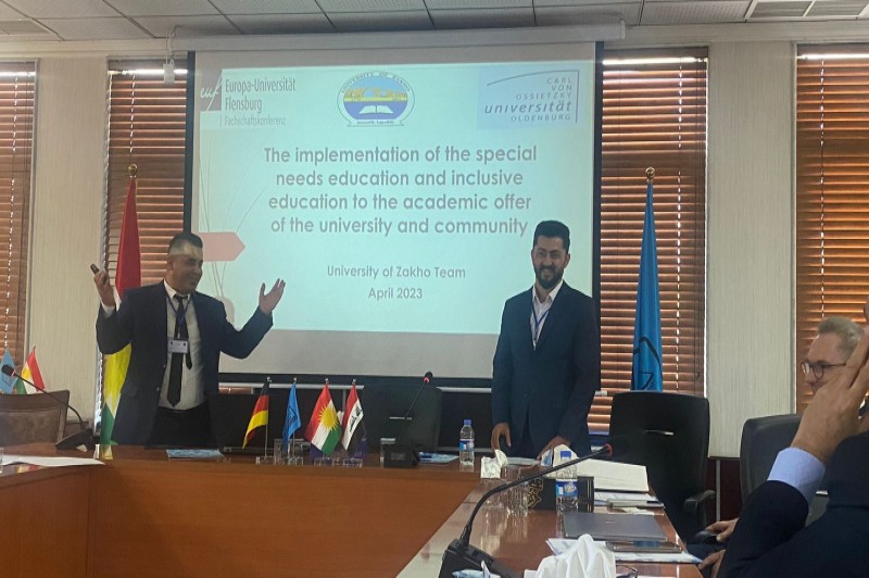 The main focus of the conference was on the innovative and modern subjects, methods, strategies of learning in Inclusive Education, and Special Need Education. The program of the conference started with an overview of the project and the steps that have been done in the project "Qualifications for Inclusive Education in Iraq and Kurdistan Region" presented by Prof. Dr. Clemens Hillenbrand, Head of the Institute for Special and Rehabilitation Education. He further laid out the steps for the next projects, the discussions, and the planning of the future events along with the cooperation between the five participating universities from Iraq and Kurdistan region and three universities from Germany. This was followed by a welcome and an introductory speech presented by Prof. Dr. Marie-Christine Vierbuchen from the Europa University in Flensburg. Later, several presentations were delivered by the staff of the five participating universities in the project. The team of the University of Zakho presented their topic on “The Concepts of Implementation of Special Needs Education and Inclusive Education to the Academic Offer of the University and the Community” presented by both Asst. Prof. Ivan H. Murad and Asst. Prof. Khorsheed Mohammed Rasheed. On the second day of the conference, two field visits were conducted: one to Naz Private Autism Center, and the other was paid to Duhok Public Health Center. Later on, the reflection on the visits to the aforementioned centers was discussed. The conference ended with two presentations delivered by the delegation from the two German universities: Oldenburg and Europa University in Flensburg. The first presentation was entitled “High Leverage Practices for Inclusive and Special Education”. It was delivered by Prof. Dr. Hillenbrand and the second was entitled “Social Information Processing and Inclusive Education” which was presented by Prof. Dr. Marie-Christine Vierbuchen from the Europa University in Flensburg.