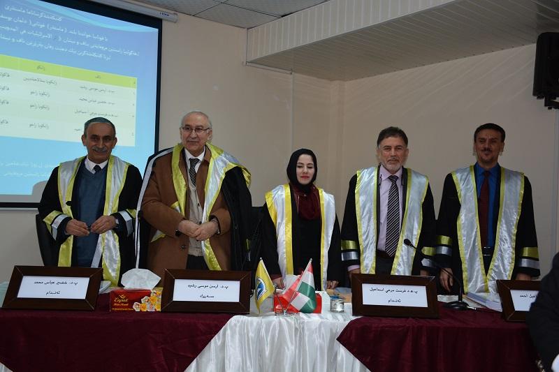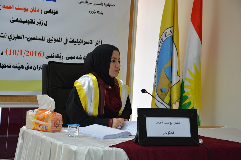 On Monday, the 10th of January 2016 at 9:00 a.m. at the Seminar Hall of the Faculty of Humanities the Masters Thesis Defense of Ms. Dilman Yousif Ahmed, a postgraduate student from the Department of History at the University of Zakho, on Impact of Israelites on the History of the Islamic Scholar Al-Tabari took place.