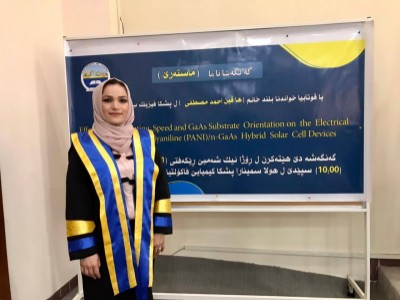 On Sunday, February 21, 2021, the master thesis of Havin A. Mustafa, from the Department of Physics, entitled (Effect of Spin Coating Speed and GaAs Substrate Orientation on the Electrical Performance of Polyaniline (PANI )/n-GaAs Hybrid Solar Cell Devices), was discussed at the Hall of Chemistry-Faculty of Science.