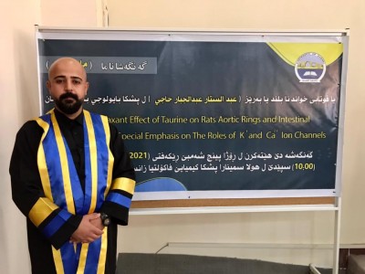 On Thursday, May 20, 2021, the master dissertation of Mr. Abdul-Satar A. Haji, a student at the Department of Biology, was discussed. His master thesis was entitled “The Relaxant Effect of Taurince on Rat Aortic Rings and Intestinal Segments with special Emphasis on The Rocles of K + AND cA + iON cHANNELS”. It took place at the Hall of Chemistry-Faculty of Science.