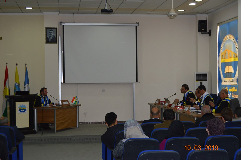On Sunday, March 10, 2019, at 10:30 am the master thesis of Mr. Yousif G. Arshak, a higher education student from the Department of Computer Science, entitling "A New Hybrid Feature Selection Approach Based on Cuttlefish Algorithm and K-Nearest Neighbor for Gene Expression Data", was discussed at the Hall of Chemistry-Faculty of Science.