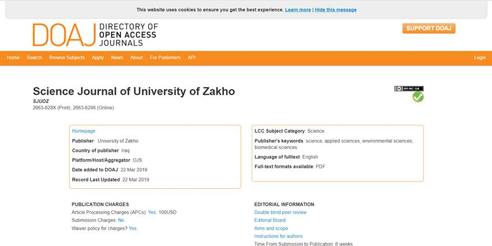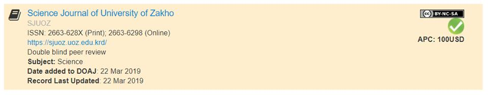 Scientific Journal of the University of Zakho Has Been Indexed by DOAJ (Directory of Open Access Journals)