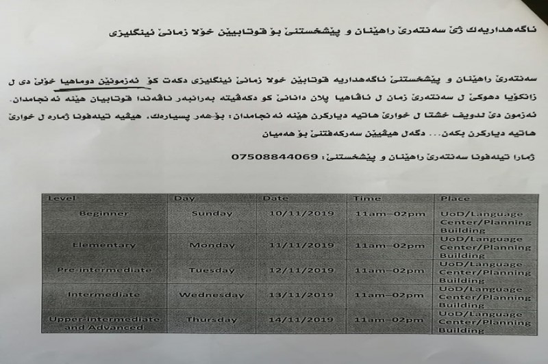The Training and Development Center at the University of Zakho informs students of English Language Course that the final exam of the course will be conducted at the Planning building at Dohuk University.