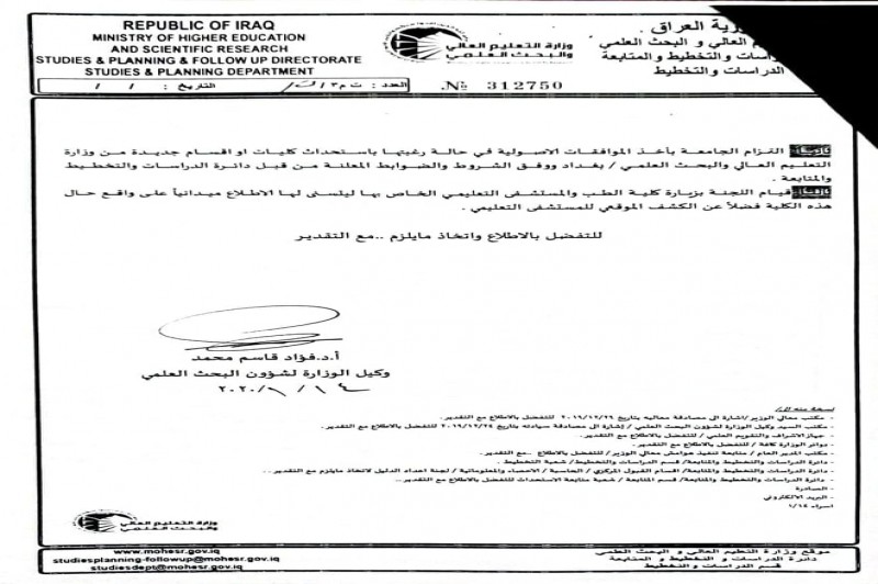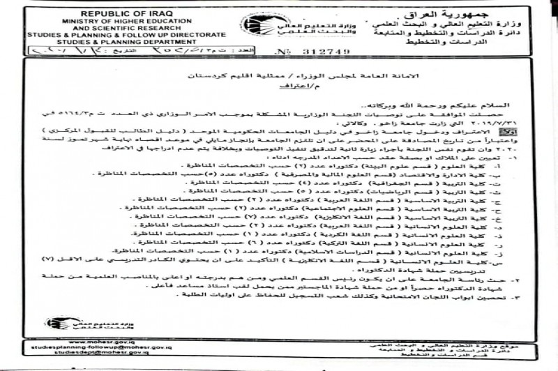 The Ministry obliged the University of Zakho to complete a number of recommendations that it had made no later than the end of July of this year provided that the same committee visits the university for the purpose of follow-up, scrutiny and the university's implementation of the announced recommendations.