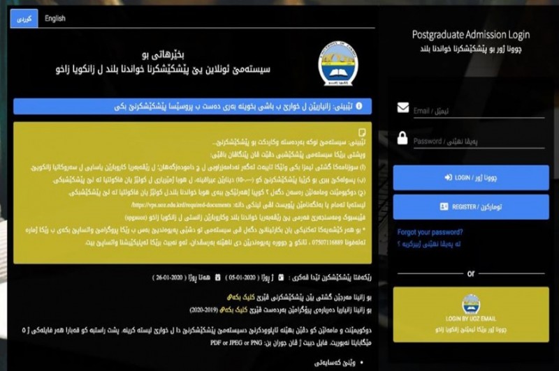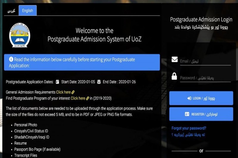 For the purpose of making progress in higher studies (Master and Doctoral), the presidency of the University of Zakho in collaboration with the Directorate of ICT and Statistics Center at the University of Zakho, has developed an electronic system for postgraduate admission.