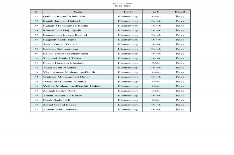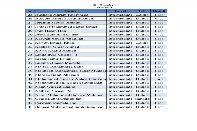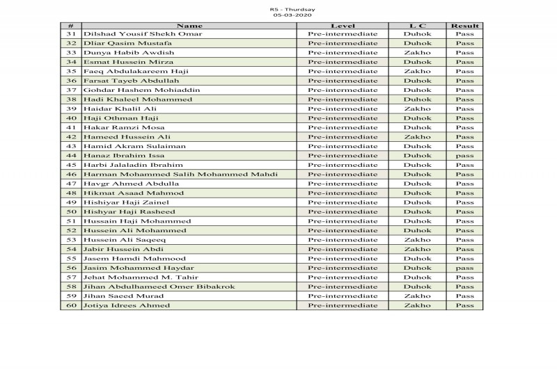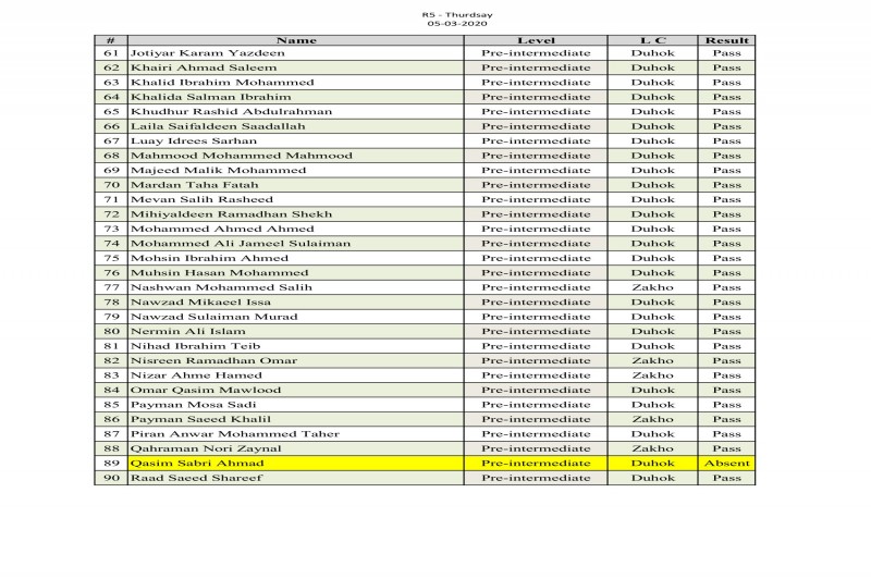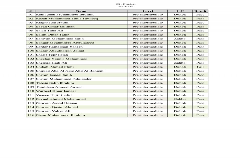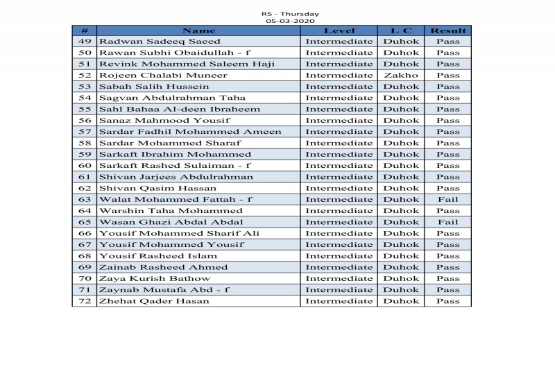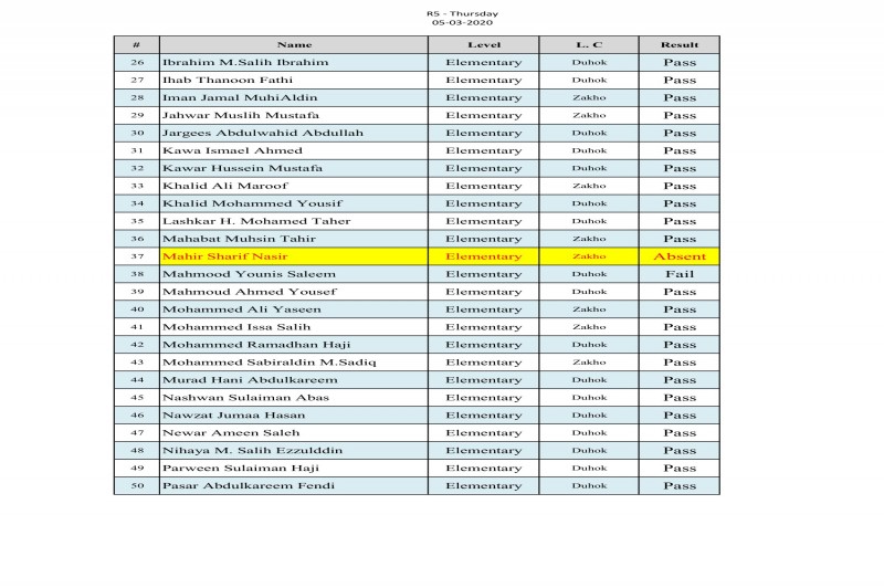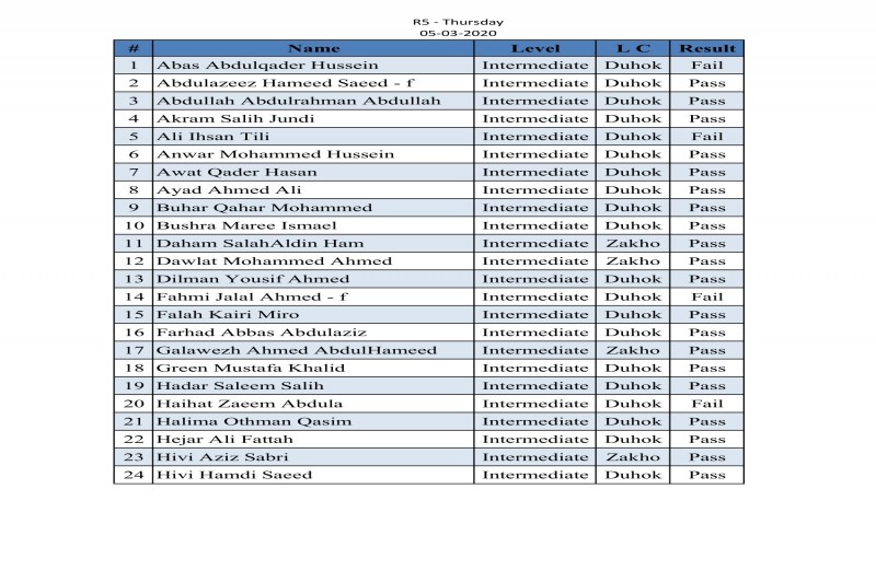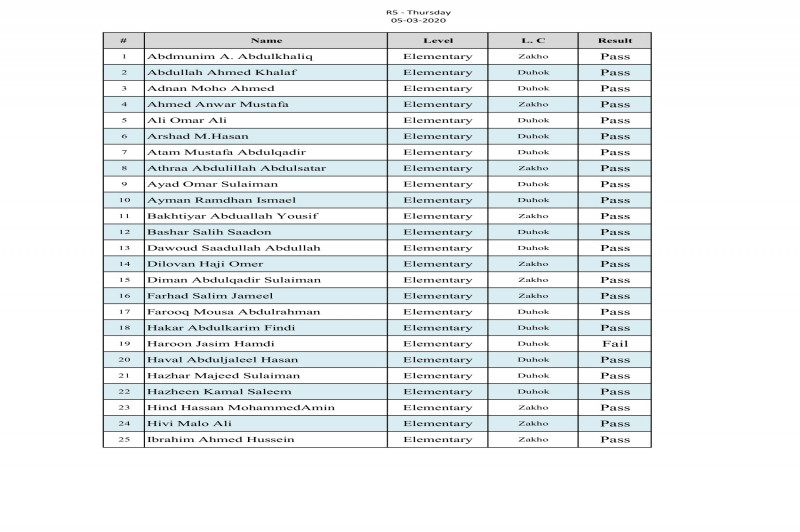 The language center of the University of Zakho announces the results of the English language test in its fifth round, which was recently held in the Duhok and Zakho centers, and the passing rate for the test is as shown: