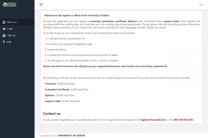 The new system is characterized by many features, specifications and services that keep pace with the current progress, and the applicant can request his/her university graduate certificate easily by entering the system and registering his/her name and entering information and choosing the type of certificate in the language he/she desires (Arabic, Kurdish, English), and the applicant can also add an additional name to receive the certificate instead of him/her if he/she is unable to receive.