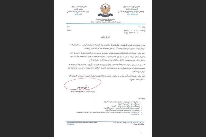 پشتى بهلاڤبوونا پهتایا كۆرۆنا ئهو ههمى لێكهفتیێن هاتینه پێش ڤهگهریانا ئهوان قوتابیێن كو ژدهرڤهى وهلاتى دخوینن، ژبۆ بهرژهوهندیا گشتى ب ئیمزایا دكتۆر (ئارام محمد قادر) وهزیرێ خواندنا بلند و ڤهكۆلینێن زانستى ب نڤێسینا ژماره (350) ل ڕێكهڤتى (12/05/2020) ئهڤ بریارێن لخوارێ هاتنه دان: