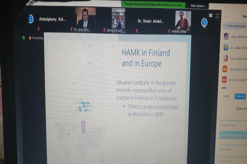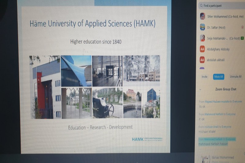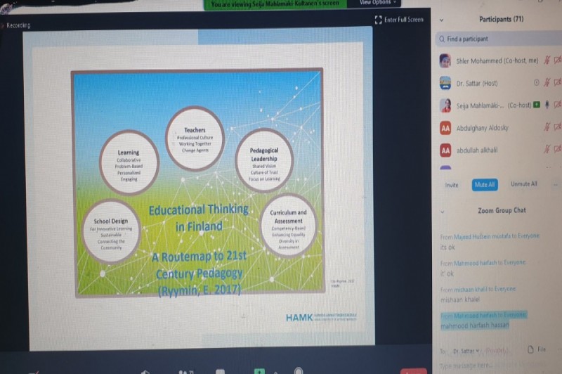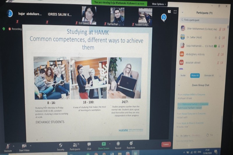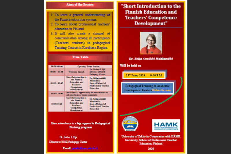 ل ڕۆژا پێنچ شه‌مبى ڕێكه‌فتى 25/06/2020، سه‌نته‌رێ ڕاهێنانا پێداگۆجى و په‌ره‌پێدانا ئه‌كادیمى یێ زانكۆیا زاخۆ ب هه‌ماهه‌نگى دگه‌ل زانكۆیا هامك یا زانستێن پراكتیكى (HAMK Häme University of Applied Sciences) یا فینله‌ندى، ڕێڤه‌به‌رێ سه‌نته‌رێ ڕاهێنانا پێداگۆجى و په‌ره‌پێدانا ئه‌كادیمى ل زانكۆیا زاخۆ، به‌رێز (پ.ه.د. ستار جبار حاجی)، هێژا (Seija Annikki Mahlamäki) ڕاگرا سكۆلا فێركرنا مامۆستایێن پرۆفیشینال (Professional Teacher Education  Dean of School of ) ل زانكۆیا هامك یا فینله‌ندى داخوازكرن بۆ پێشكێشكرنا سمیناره‌كێ بۆ پشكدارێن خۆلا پێداگۆجى، ب شێوێ أونلاین لژێرناڤ و نیشانێن "Short Introduction to the Finnish Education and Teachers' Competence Development " . هه‌ژى گوتنێ یه‌ كۆ زانكۆیا هامك سه‌رپه‌رشتیا پرۆگرامێ پێداگۆجى كربوو ئه‌وێ هاتییه‌ ڕێكخستن دناڤبه‌را وه‌زاره‌تا خواندنا بلند و ڤه‌كولینێن زانستى یا هه‌رێما كوردستانێ و زانكۆیا (HAMK Häme University of Applied Sciences) یا فینله‌ندى.