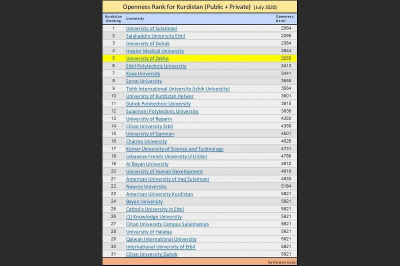 بۆ نموونه لسهر هێلا ئامادهبوونا ڕاستهوخۆ لسهر ئینتهرنێتێ ل سهر ئاستێ زانكۆیێن ههرێما كوردستانێ یێن حكومى و تایبهت ل ڕێزا حهفتێ هاتییه، ههروهسا بكارهینانا ڤهكۆلین و ناڤێ زانكۆیێ د ڤهكۆلیناندا ل ڕێزا پێنجێ یه، ههروهها لسهر بنهمایێ كاریگهریێ دیسان ل ڕێزا یازدێ جهێ خۆ گرتییه لسهر ئاستێ زانكۆیێِن حكومى و تایبهت یێن كوردستانێ. وهك تێكرا بۆ ههر پێنج ڕێزبهندییان لسهر ئاستێ زانكۆیێن كوردستانێ ل ڕێزا (10) و ل سهر ئاستێ ئیراقێ ل ڕێزا (33) بۆ ههمى زانكۆیێن حكومى و تایبهت.