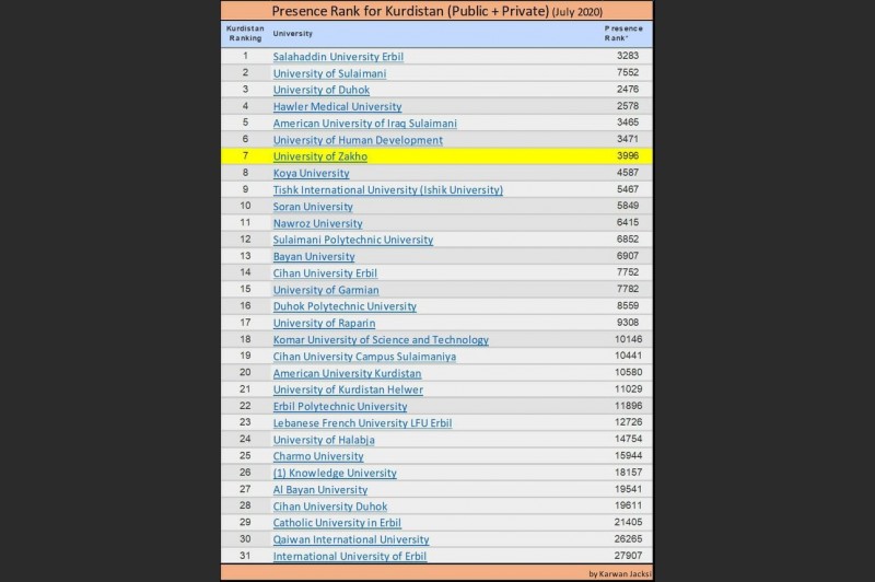 لدهستپێكا مهها ئێك یا ئهڤ ساله سازییا (وێبوماتریكس) ڕێزبهندییا زانكۆیێن جیهانێ لسهر چهندین پیڤهر و خالێن ئهكادیمى ڕاگههاند، ههژییه بێژین كو زانكۆیا زاخۆ ئێك ژ ئهوان زانكۆیانه یا كو بوویه جهێ گرنگیپێدان و لسهر ڕاوهستیانێ، ژبهركو د چهندین بیاڤێن ههلسهنگاندنێدا ل ڕێزێن دهسپێكێ هاتییه و خالێن ههرهباش لسهر ئاستێ جیهانێ و ئیراقێ و زانكۆیێن ههرێما كوردستانێ كۆمكرینه.