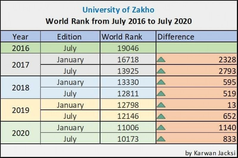 زانكۆیا زاخۆ د چهندین بیاڤێن دیتر دا پێشكهڤتنهك بێ ههمپا تۆماركرییه و كارمهندێن سازییا وێبوماتریكس ب پێشكهڤتن و وهرارا خۆ مهندههوش كرینه، ژبهركو ژ مهها ئێك یا ئهڤ ساله ههتا مهها حهفت ژ پلهیا (11006) هاتییه پلهیا (10173) ههلبهت ئهڤ چهنده كارهكێ ب ساناهى نینه و جهێ دهستخۆشیێیه بۆ زانكۆیێ و ستافێ كارى.