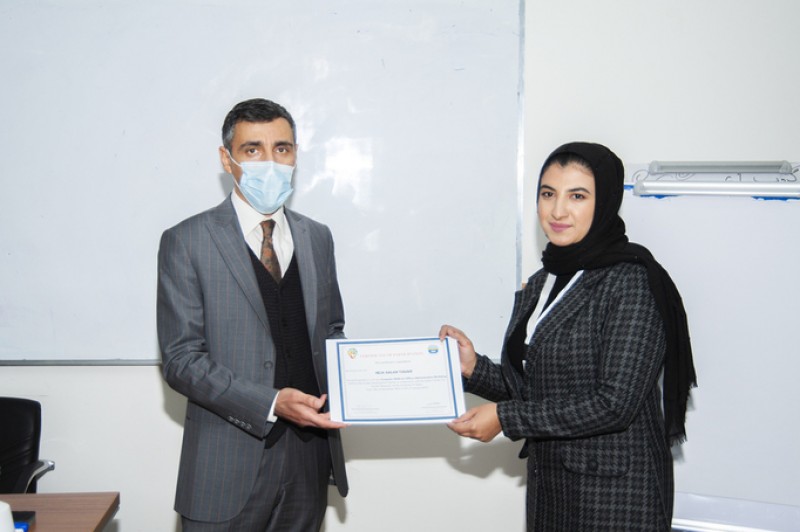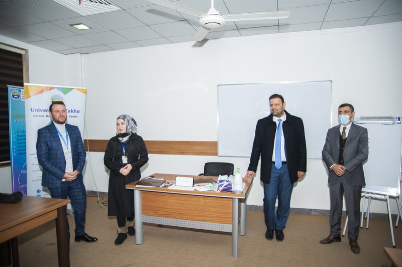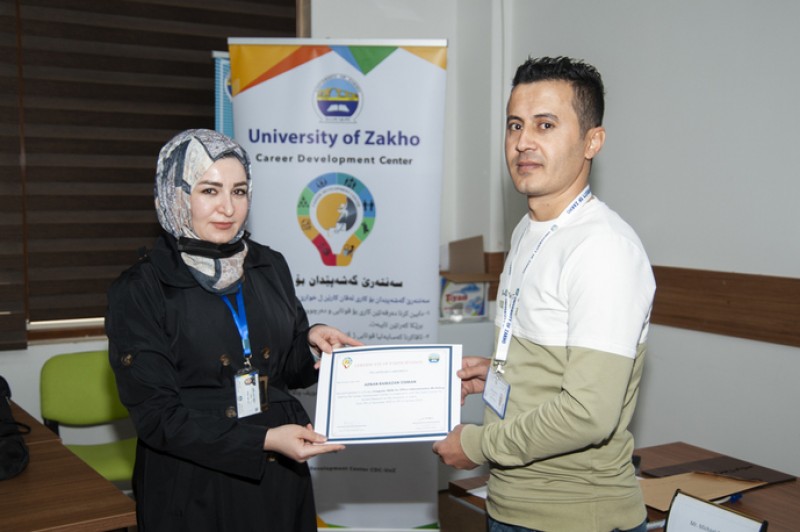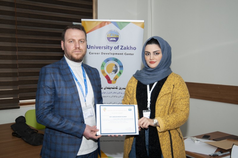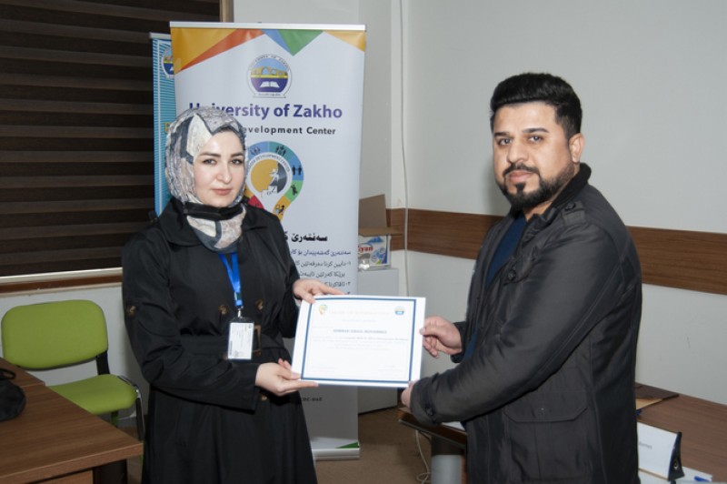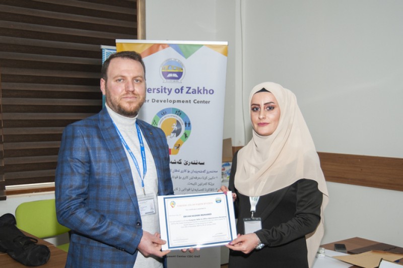 In the presence of the Vice President for Students Affairs Dr. Karwan Fahmi Sami, the Director of Zakho Centre for Kurdish Research Dr. Abdulsalam N. Abdullah, the Director of Career Development Centre Ms. Berivan Mohammed Ahmed, and the trainer Mr. Yousif Garabet Arshak, the trainers and participants were granted a certificate of participation.