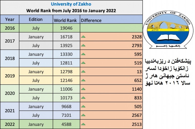 As reported in the recently updated ranking list of world’s universities, which was published in January of the current year, the University of Zakho has obtained the position of '4588'. In the previous year, in July particularly, Zakho University was ranked ‘7101’. It is vital to highlight that the University of Zakho has attained the rank of ‘29’ in the ranking of Iraqi universities, the rank of ‘238’ at the level of Arab universities and the rank of ‘473’ at the level of Asian universities.