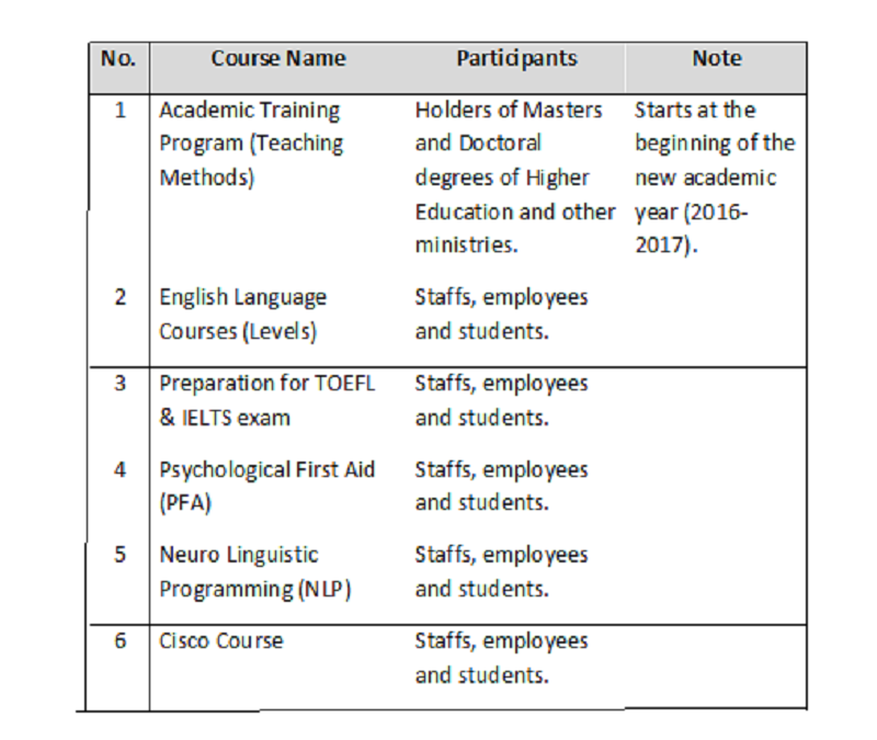 The Center of Training and Development is opening a number of training and development courses this summer as shown in the table below and it is mainly for teachers, university staffs and government employees. To apply for these courses, please visit our center that is located at the UOZ presidency building, 3rd floor.