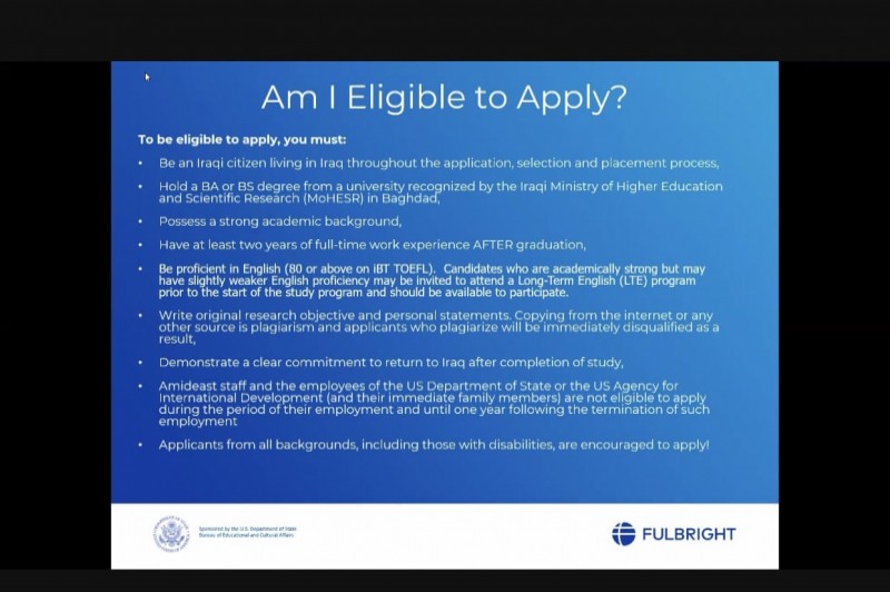 The webinar was led by Ms. Viyan S. Haji, CDC Coordinator at the College of Education at the University of Zakho. Moreover, it aimed at introducing the Fulbright Program to the university graduates in order to successfully apply for the program.