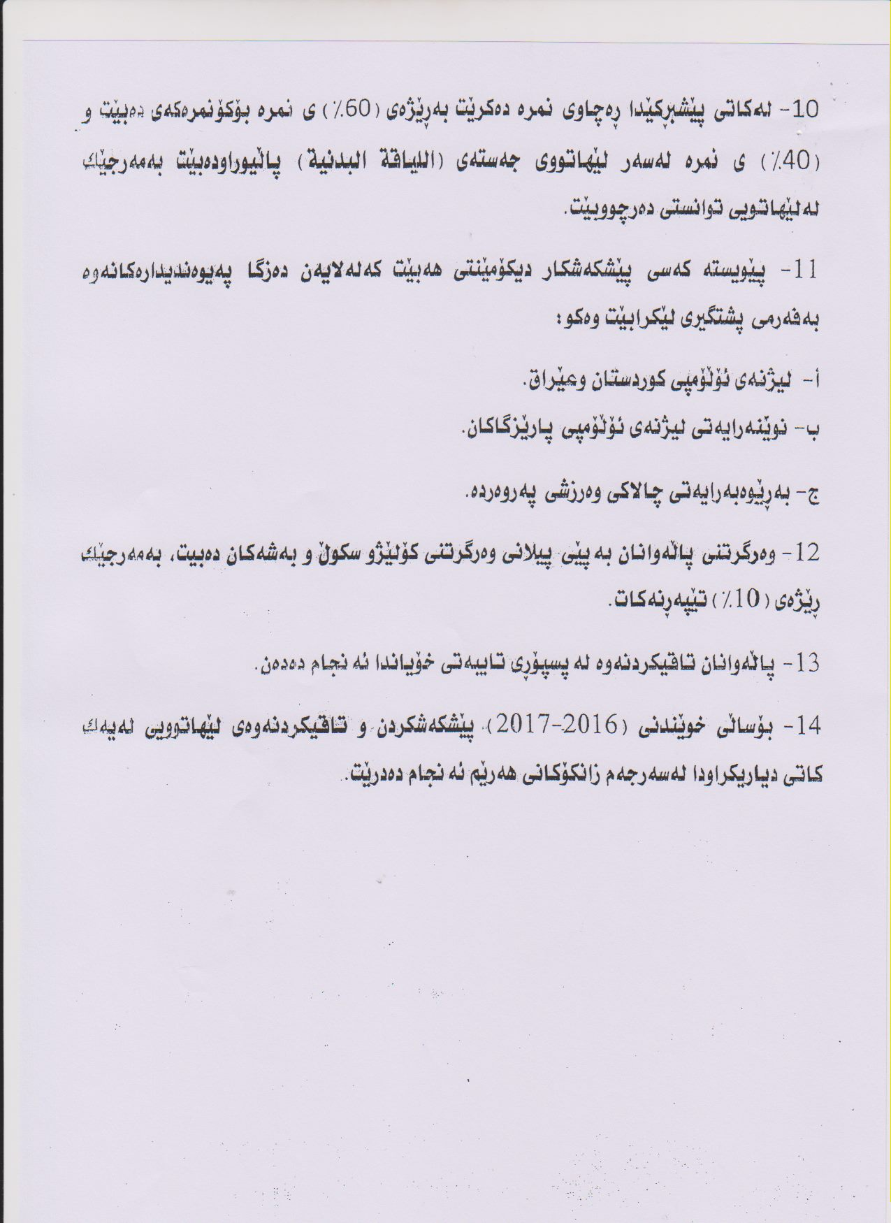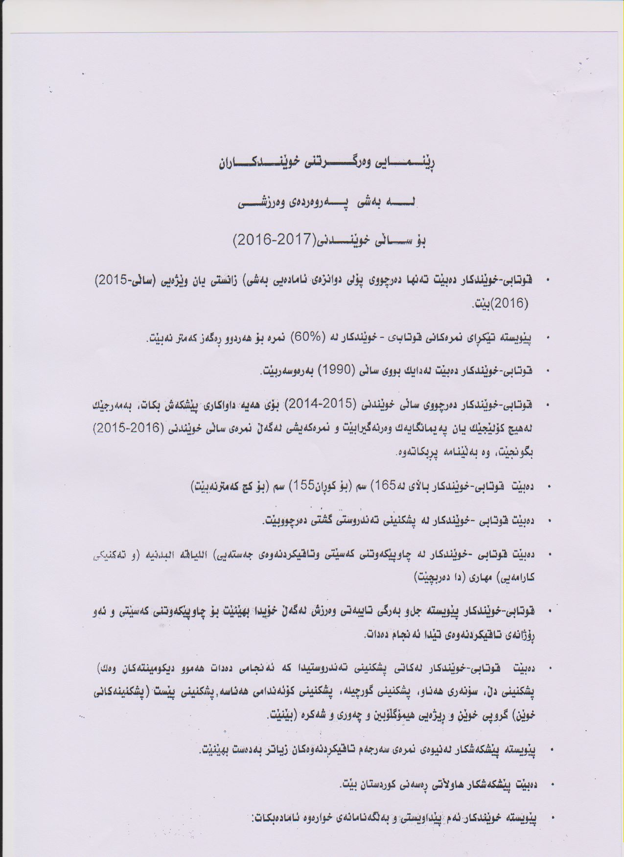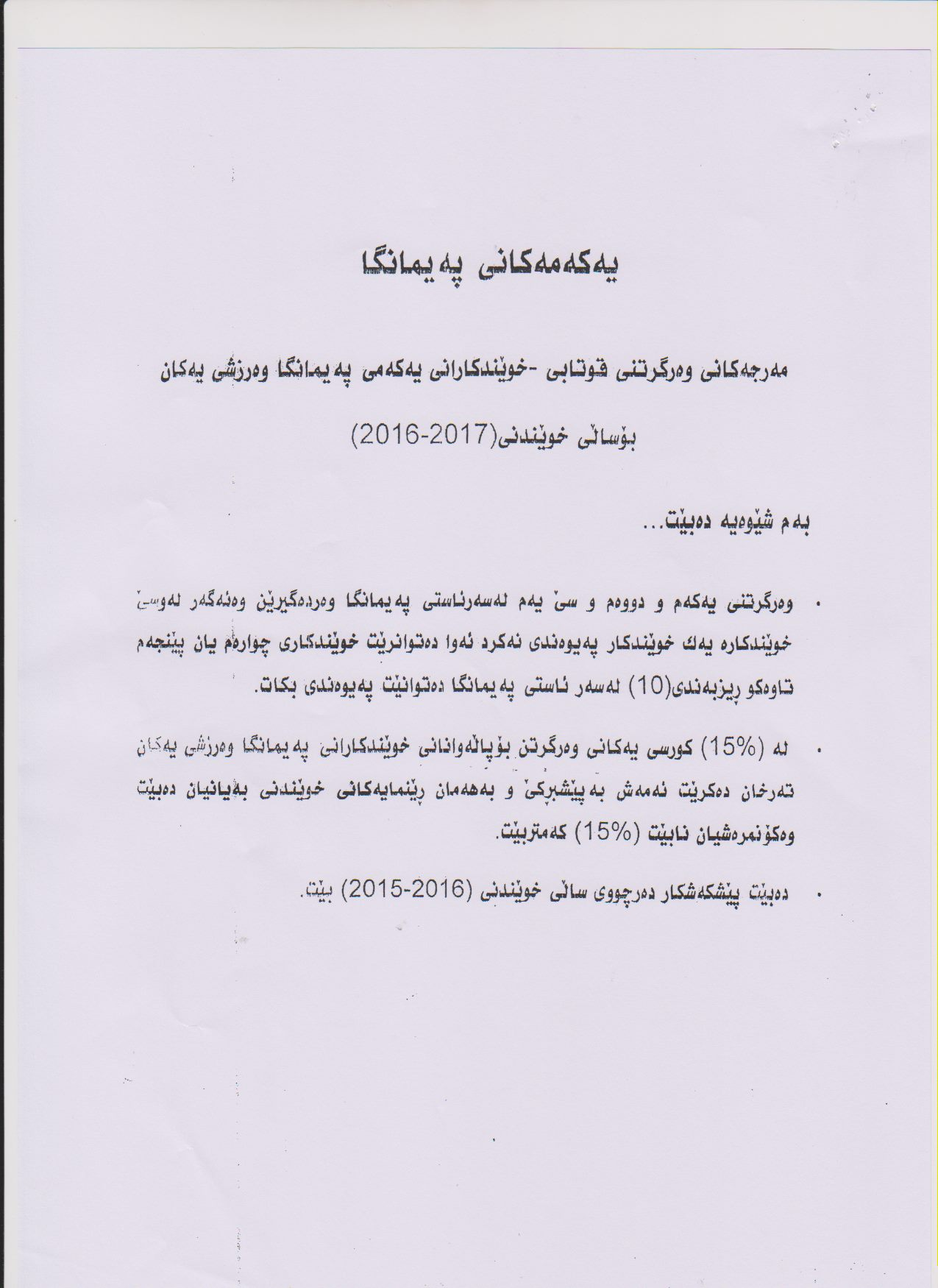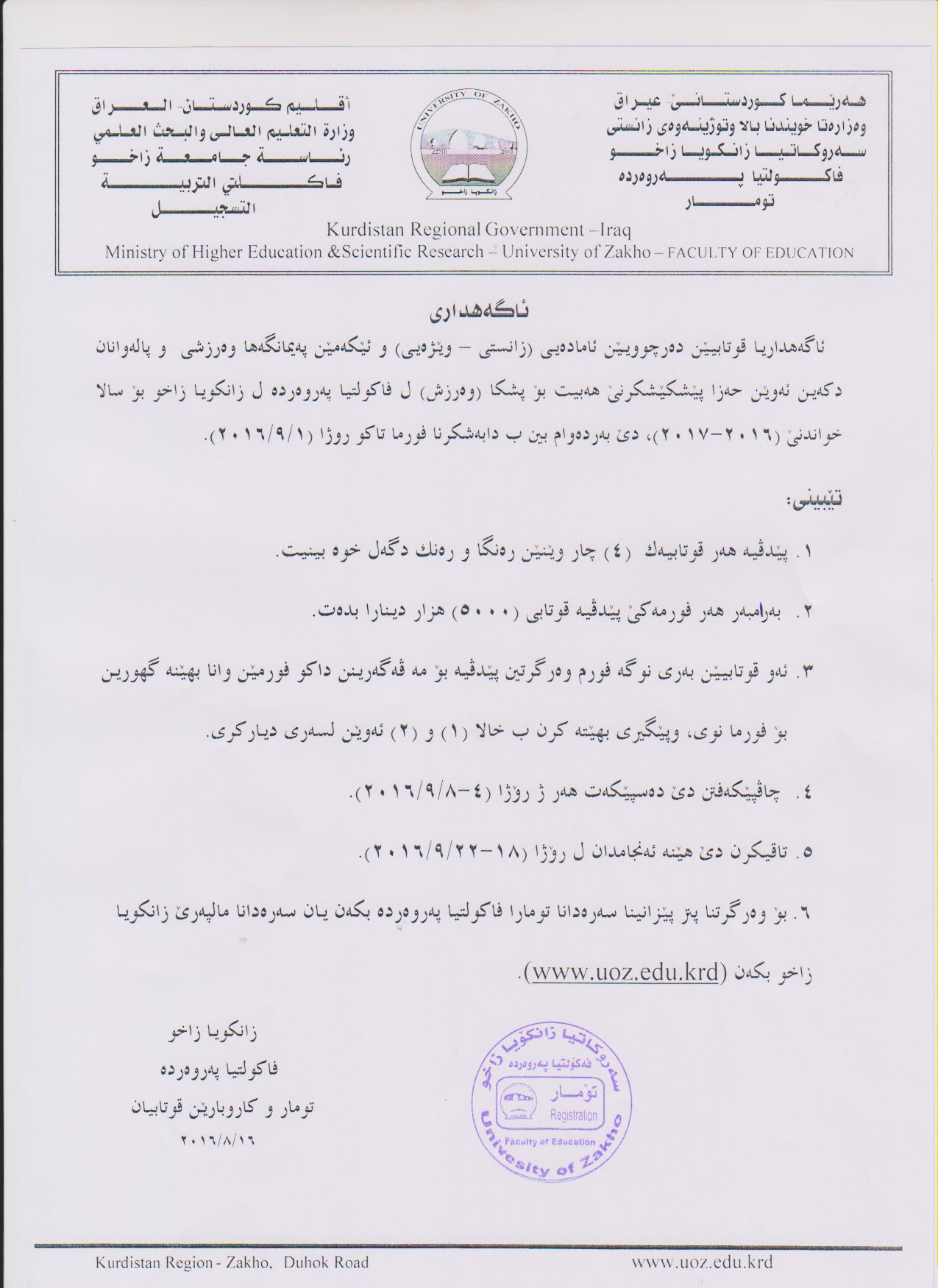 The faculty of physical education informs the both branches' graduates of 12th grade , as well as top students of physical education institutions and champions, of the ability to apply for this department at the University of Zakho and for the academic year 2016-2017, by visiting the registration office of the department in order to get the forms of registration.