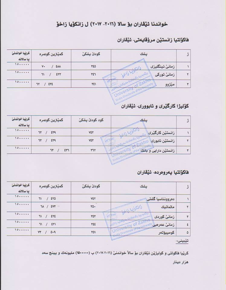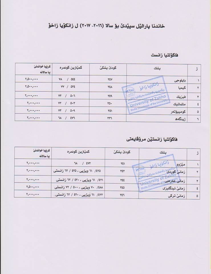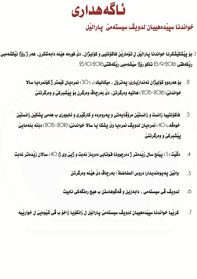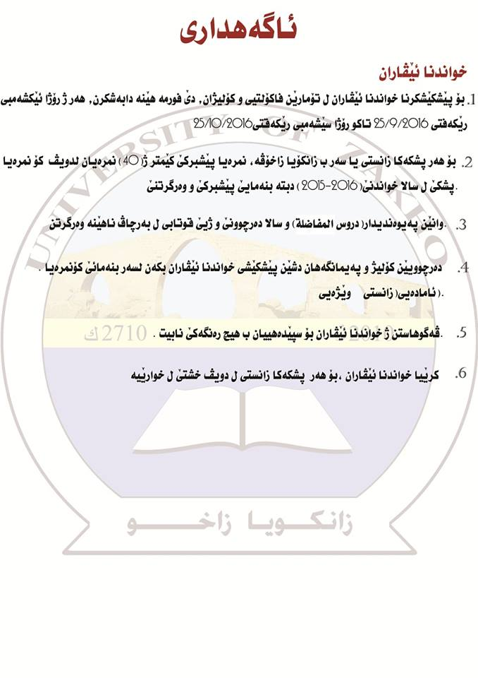 The University of Zakho announces the openning of the morning and evening classes ( parallel), accordingly, the interested ones should come to the university as soon as possible.