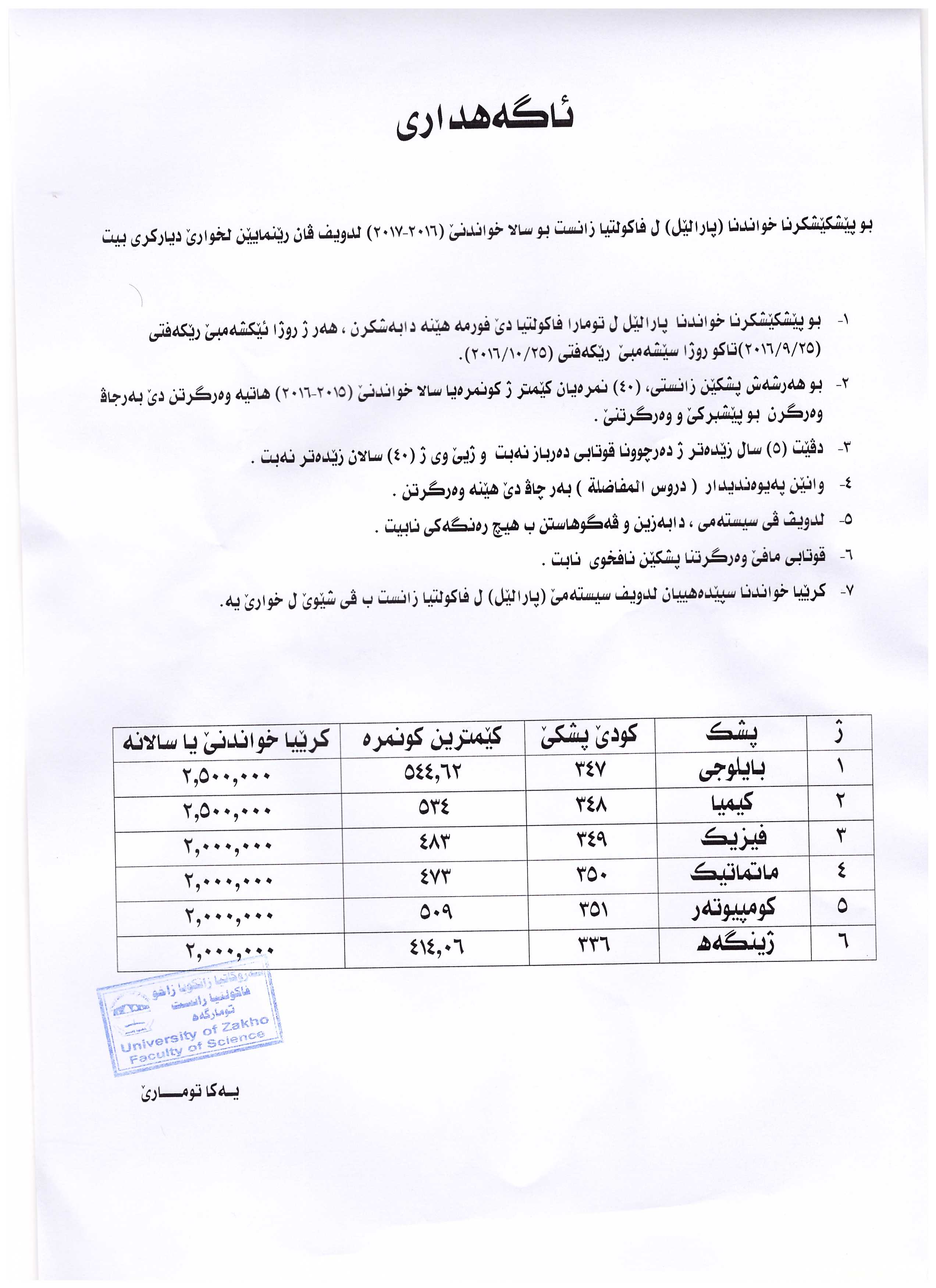 The Faculty of Science at the University of Zakho announces the new instructions for the parallel studies for the Academic year (2016-2017).