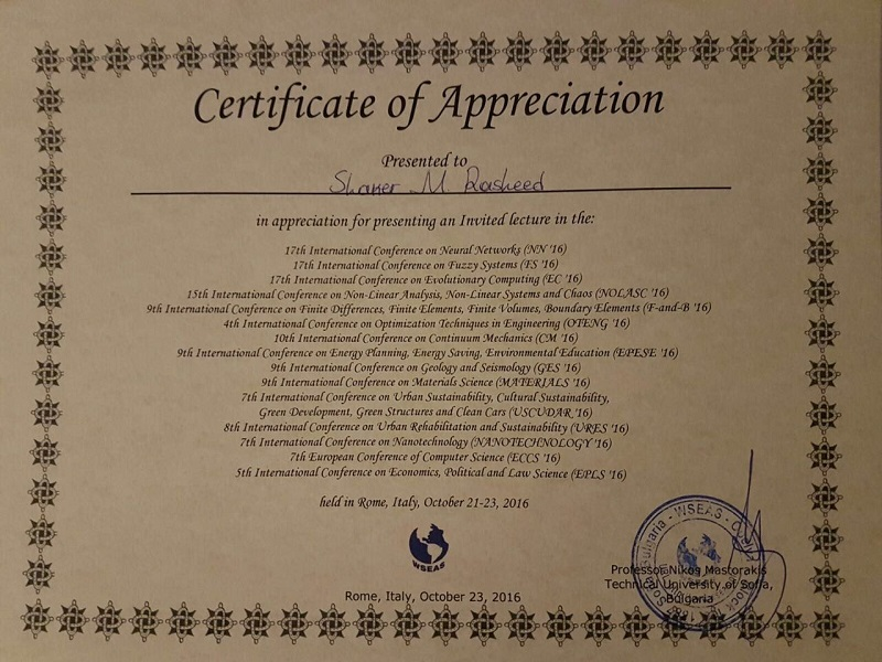 Dr. Shakir M. Rasheed, lecturer at the department of Mathematics of UOZ, represented the University of Zakho in the 9th International Conference Finite Difference, Finite elements, Finite volumes, Boundary Elements (F-and-B" 16) as a part of WSEAS in Rome, Italy from 21 till 23 of October, 2016. Dr. Rasheed presented his paper on "A comparison Between Finite Difference and Asymptotic Methods for Solving a Reaction-Diffusion model in Ecology." And which has been accepted in a journal indexed in SCOPUS.