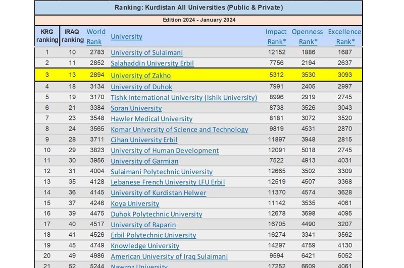 As reported in the recently updated ranking list of the world’s universities, the University of Zakho has obtained the position of '2894'. It is vital to highlight that the University of Zakho has attained the rank of ‘3’ among the governmental universities of the Kurdistan Region, and the rank of ‘16’ among Iraqi universities.