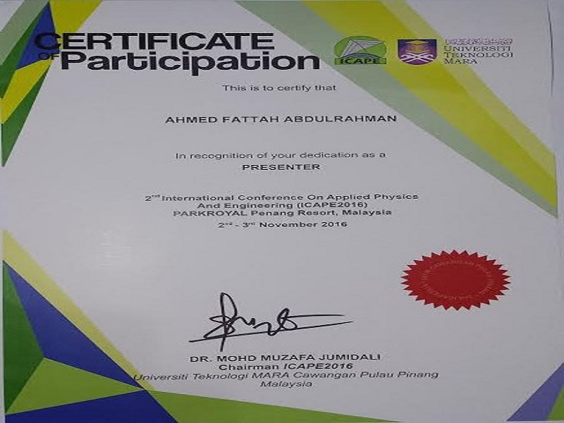 Mr. Ahmed Fattah Abdulrahman, Ph.D. student and Lecturer at the Department of Physics of UOZ, represented the University of Zakho in the 2nd International Conference on Applied Physics And Engineering (ICAPE 2016) “The New Frontier In Applied Physics & Engineering” in Penang, Malaysia from 2 to 3 of November, 2016. The conference was sponsored by the University Technology Mara, Pulau Pinang, Malaysia.