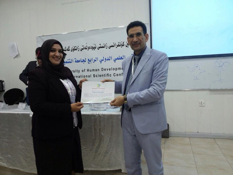 On 9th of April, 2017, under the motto "Sustainable Development", the fourth international scientific conference was held at the University of Human Development in sulaymaniyah., Dr. Ayad Kamel Ibrahim, a lecturer at the department of Islamic studies, University of Zakho, participated in the conference with the research entitled " The Difficulties and obstacles against the Kurdish state and legitimate and legal obstacles". Likewise, Mrs. Ghayda Ali Muhammed from English department read and presented her research paper which was titled “The Effect of Using a Learning-Journal, in Teaching Semantics, on the EFL 3rd-Year College Students’ Achievements”. At the end of the conference, the participants were awarded certificates of participation.