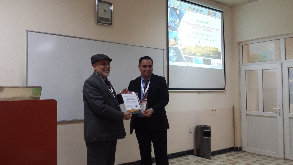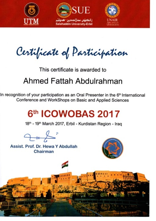 On Saturday, 18th March, 2017, Mr. Ahmed Fattah Abdurrahman, a Lecturer at the Department of Physics of UOZ, represented the University of Zakho in the 6th International Conference & Workshop on Basic and Applied Sciences (ICOWOBAS 2017), 18th -19th March 2017 in Erbil, Kurdistan Region-Iraq. It is worth mentioning that more than 500 participants joined the conference from 48 Universities of 11 Countries, and most of the Universities of the Kurdistan Region-Iraq participated. The Conference was organised and sponsored by the Faculty of Science and Technology, University of Airlangga (Surabaya, Indonesia), the Faculty of Science of the University of Technology, Malaysia, Ibnu Sina Institute for Fundamental Science Studies of the University of Technology, Malaysia and Salahaddin University-Erbil, Kurdistan Region. More than 250 researchers and speakers from around the world presented their researches, and participants were engaged in panel discussions. During the conference, Mr. Ahmed has given a 15-minute oral presentation on his scientific research paper and participated in the discussion sessions. The paper entitled “Effect of the Growth Time on the Optical Properties of ZnO Nanorods Grown by Low-Temperature Method for UV Photodetector Applications” which has been accepted in a Journal indexed in SCOPUS. At the end, the Mr. Ahmed was awarded the certificate of participation.