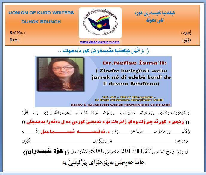 On Thursday 27th of April, 2017 at 5:00 pm. in the presence of Mr. Hassan Slevanay, President of the Union of Kurdish writers, a number of Kurdish intellectuals and writers, the Union of Kurdish writers in Duhok organised a cultural season of the readings. Then, Dr. Nafisa Ismail Haji, present and analysis a series of the short story of Kurdish literature of the Bahdinan part. At the end of the season, the door for interventions was opened, and many constructive discussions were held between the presenters and audience.