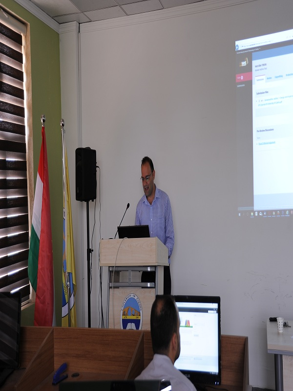 On Wednesday, 10th of May 2017, at 10:00 am, in the presence of Assist. Prof. Dr. Yassin Taha Mustafa, Vice President for Academic Affairs and Graduate Studies. Mr. Karwan Fahmy, the Director of the ICT and Statistics centre, University of Zakho, they give a workshop on "applying the electronic system of the University's magazines", for the magazine staff and lecturers of the university of Zakho, in the Cisco Hall of the Presidency of the University of Zakho. In the beginning, Dr. Yasin Taha gave a brief introduction to the subject of the workshop and their importance. After that, Mr. Karwan Fahmy delivered the speech and in an academic way talked about the importance of applying the electronic system of the magazine and their benefit to the university. In conclusion, he opened a door for the interventions, and many constructive discussions held between him and the audience. The attendees expressed their happiness for organising this workshop and extended special thanks to him for the seminar and wishing him success. It is worth mentioning that the second workshop will hold in the upcoming week on Sunday, 14th of May, 2017, at 11:00