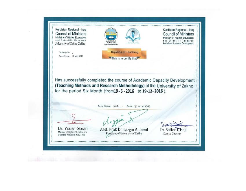 Media Directorate of the Ministry of higher education and scientific research: To raise the level of scientific, administrative and academic, the Ministry of Higher Education and Scientific Research in the Kurdistan Region for the first time give a certificate of the Academic Capacity Development to the participants of the course of the Teaching Methods and Research Methodology. On Sunday 4th of June, 2017, Dr. Yusuf Goran, the Minister of Higher Education and Scientific Research give the certificate of the Academic Capacity Development to the participants of the course of the Teaching Methods and Research Methodology and wishing them success. It is worth mentioning that, 16 students for six months participated in the scientific course. The course included the following lecture "teaching methods, development of scientific capacity and research, development of academic leadership abilities, English language and how to deliver conferences. For more information, please visit the following link: http://www.mhe-krg.org/ku/node/3550