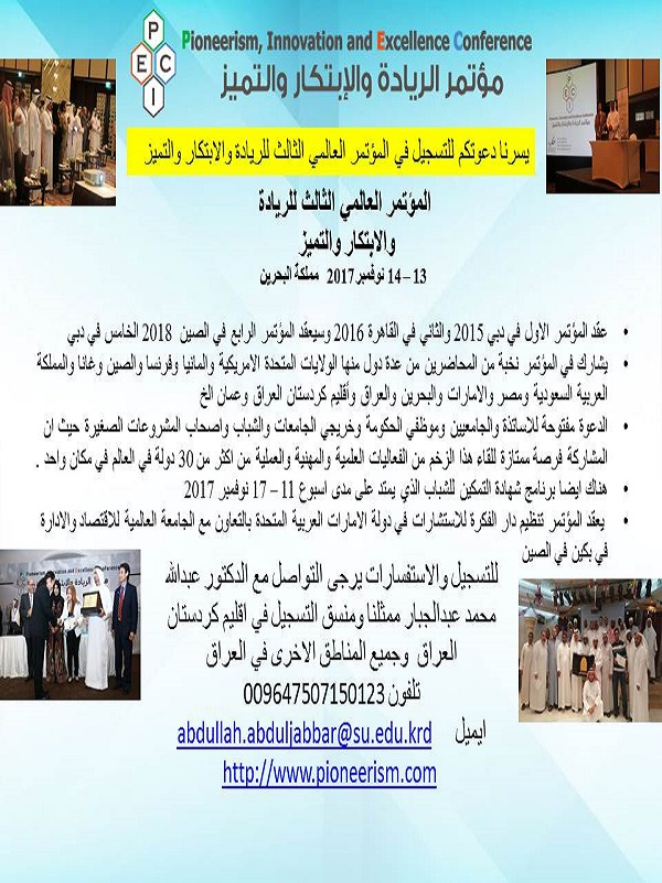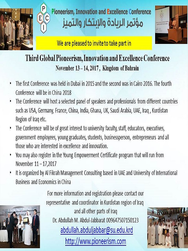 The Global Pioneerism, Innovation and Excellence Conference ( GPIEC ) is an annual global event. The Third Global Pioneerism, Innovation and Excellence Conference will be held at Bahrain Gulf Hotel in Manama, the capital of the Kingdom of Bahrain during the period November 13 - 14, 2017. The Conference will host a selected panel of professionals from around the globe to share their own experiences and stories. For more information and registration, please have a look at the below pictures: