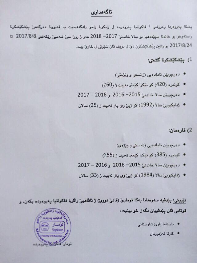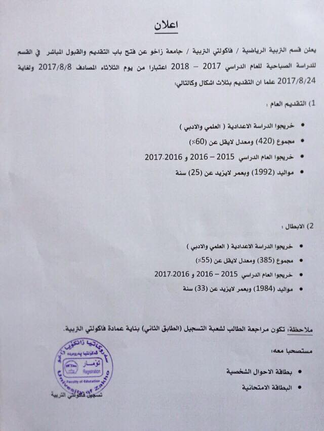 The Faculty of Education at the University of Zakho announces the opening of the application for direct admission in the Sport department for the academic (2017_2018) for the graduates of the preparatory school, its branches (scientific and literary). The application period is from 8/8/2017 to 24/8/2017. For more information, please have a look at the below pictures: