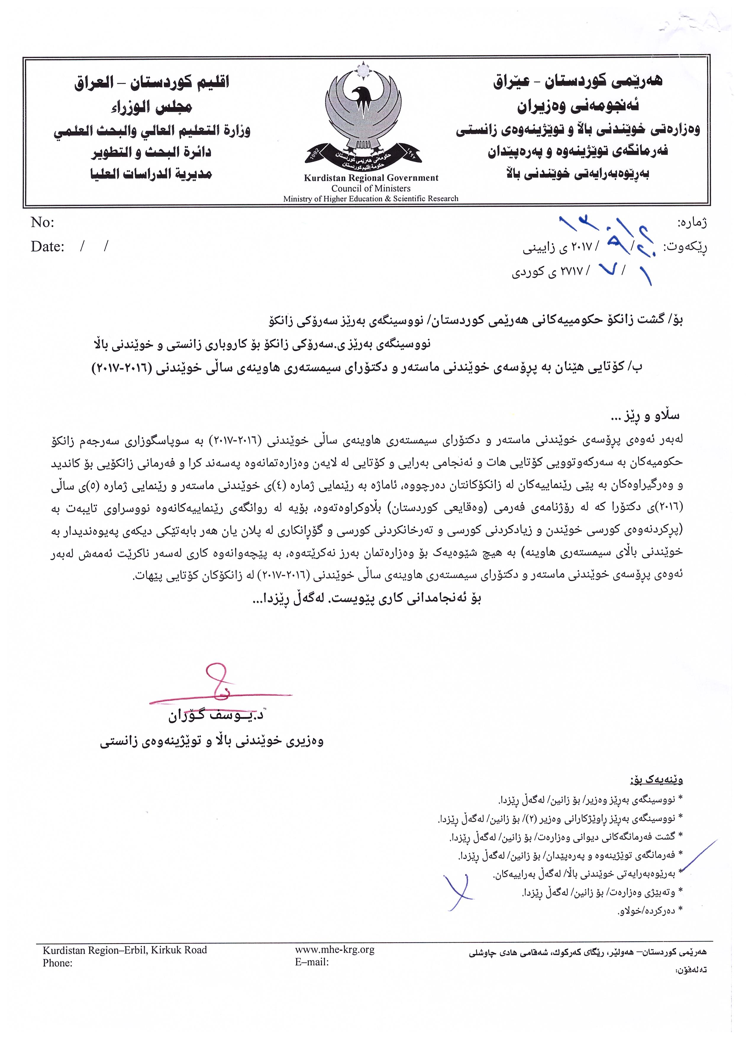 The Ministry of Higher Education and Scientific Research announces that the process of applying for higher degrees (Master and Ph.D.) for the academic year (2016-2017) is over.