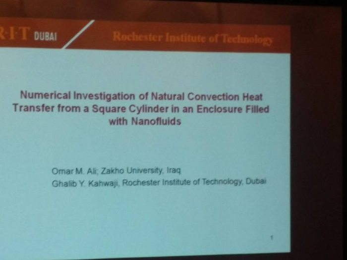 Dr. Omar M. Ali, Head of the Department of Mechanical Engineering at the University of Zakho, participated in the Third International Conference on Mechanical Engineering (MECHE 2015), which was held at the Coral Hotel, Dubai, UAE, from 6th to 7th of November 2015. Dr. Omar M. Ali attended in this conference and presented his oral presentation with a paper entitled Numerical Investigation of Natural Convection Heat Transferfrom Square Cylinder in an Enclosed Enclosure Filled With Nanofluids with Prof. Dr. Ghalib Y. Kahwaji/ RTI/ Dubai.