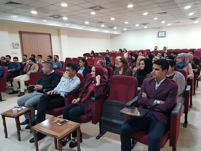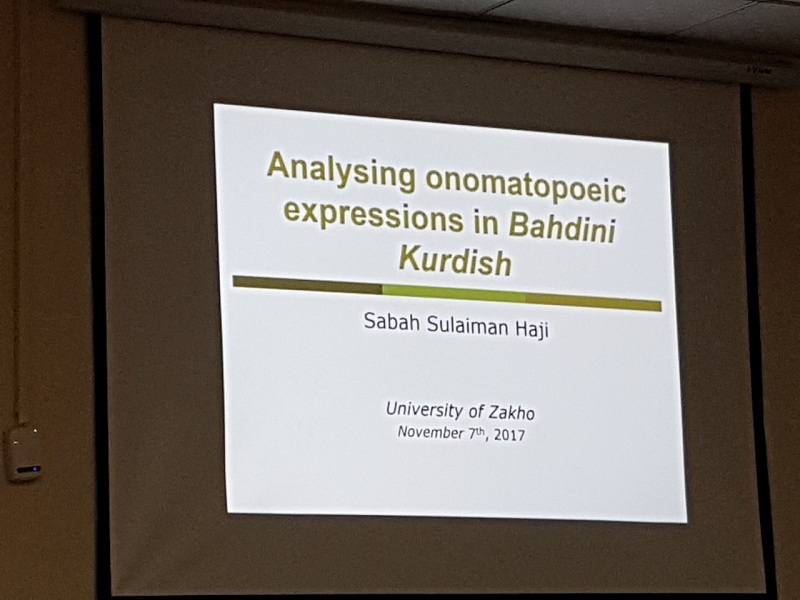 As part of the weekly activities of the Department of English, on November 7th, 2017, a workshop was held for the faculty member Mr. Sabah S. Haji, at the Khalil Khayali seminar hall of the Faculty of Humanities. The seminar was entitled ‘Analysing Onomatopoeic Expressions in Bahdini Kurdish’, that is, a linguistic analysis of the words that represent natural sounds in everyday conversational Bahdini Kurdish. These natural sounds were classified into sounds of human beings, animals, insects, birds, objects and other natural phenomena such as the sound of rivers, waterfalls, trees, winds, thunder, clouds and earthquakes. It is worthwhile to mention that the seminar was attended by most of the administrative and teaching faculty members of the Department of English as well as some teachers from other faculties and departments and a noticeable number of students from the English language department. After the end of the seminar, the attendees asked the presenter some questions about various aspects of the seminar topic, which were in turn answered by the presenter.