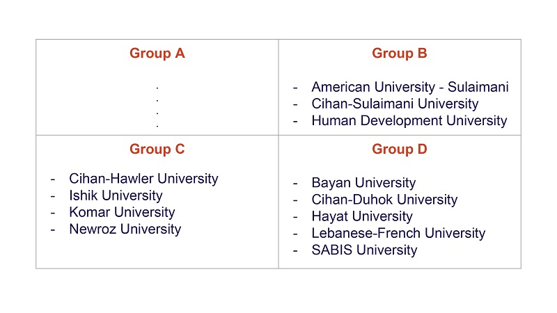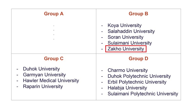 Group B: Koya University, Salahaddin University-Erbil, Soran University, University of Sulaimani, University of Zakho