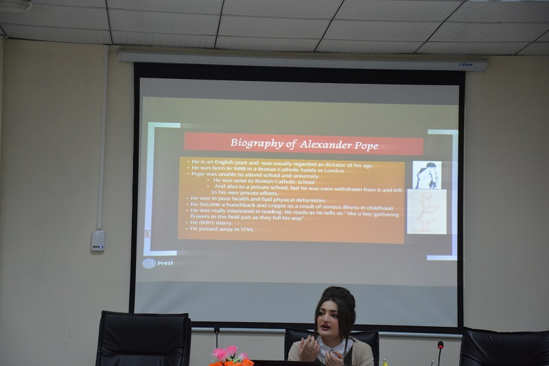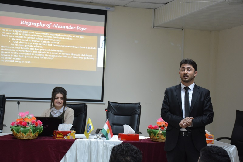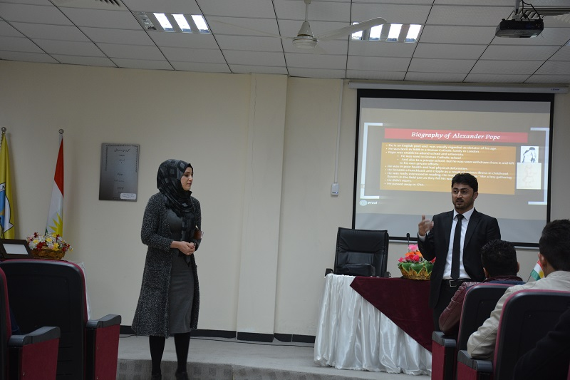 In collaboration with Mr. Khorsheed Mohammed Rasheed, lecturer at the Department of English Language, two fourth- year students at the Department of English Language held on the 13th of December 2015 at the Seminar Hall of the Faculty of Humanities a seminar about the prominent 18th- century English poet Alexander Pope, who was dominating the Augustan Literature at this time, for their colleagues of the third- year. Following the presentation of the two students, participants took an active part in scientific debates, regarding the life of Alexander Pope.