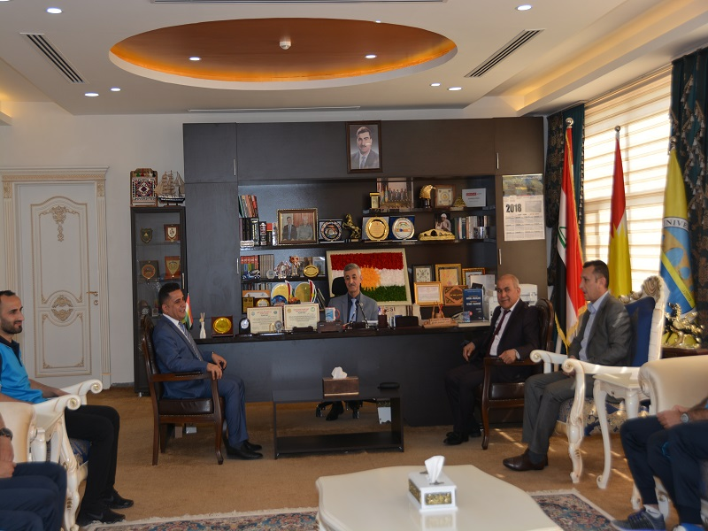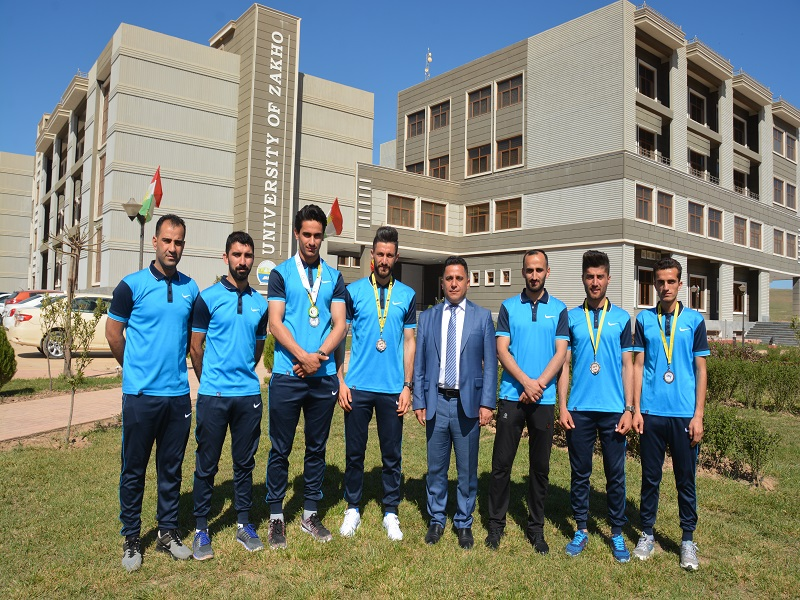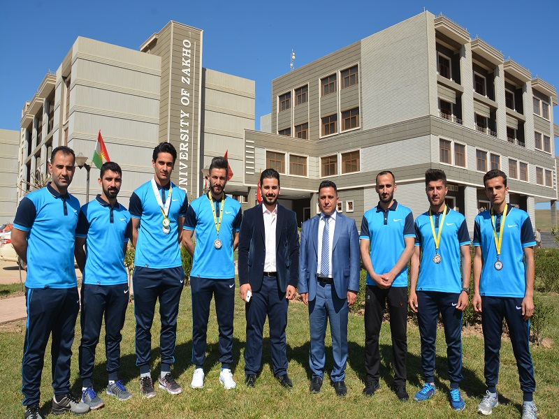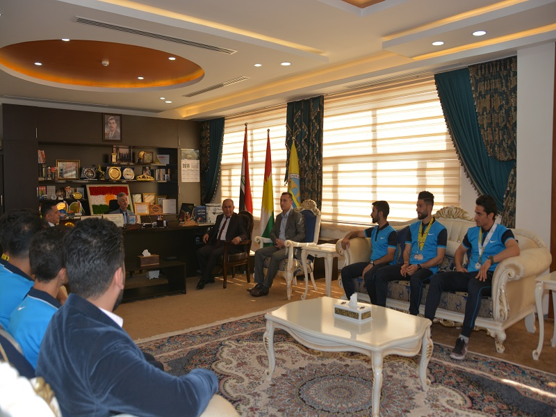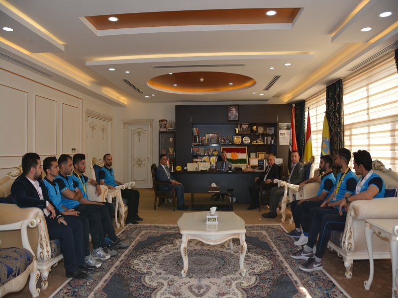 On Monday, March 26, 2018, President of the University of Zakho Assistant Professor Dr. Lazgin A. Jameel, officially welcomed the team of the university from Sport Department at his chamber. It is worth mentioning that the team participated in a championship which was held in Baghdad with the participation of 33 universities and achieved good results. That is why, the president of the university praised their efforts and showed his everlasting support to this kind of activities.