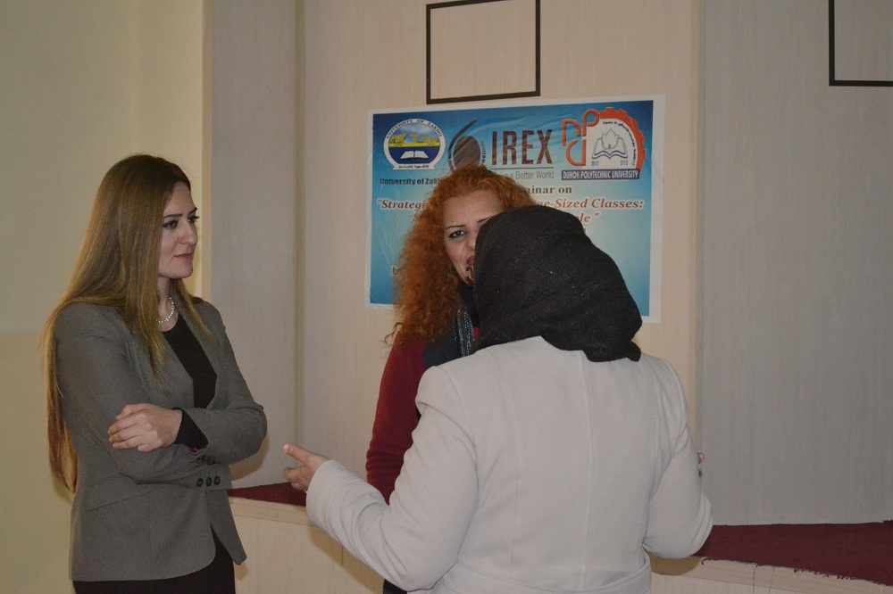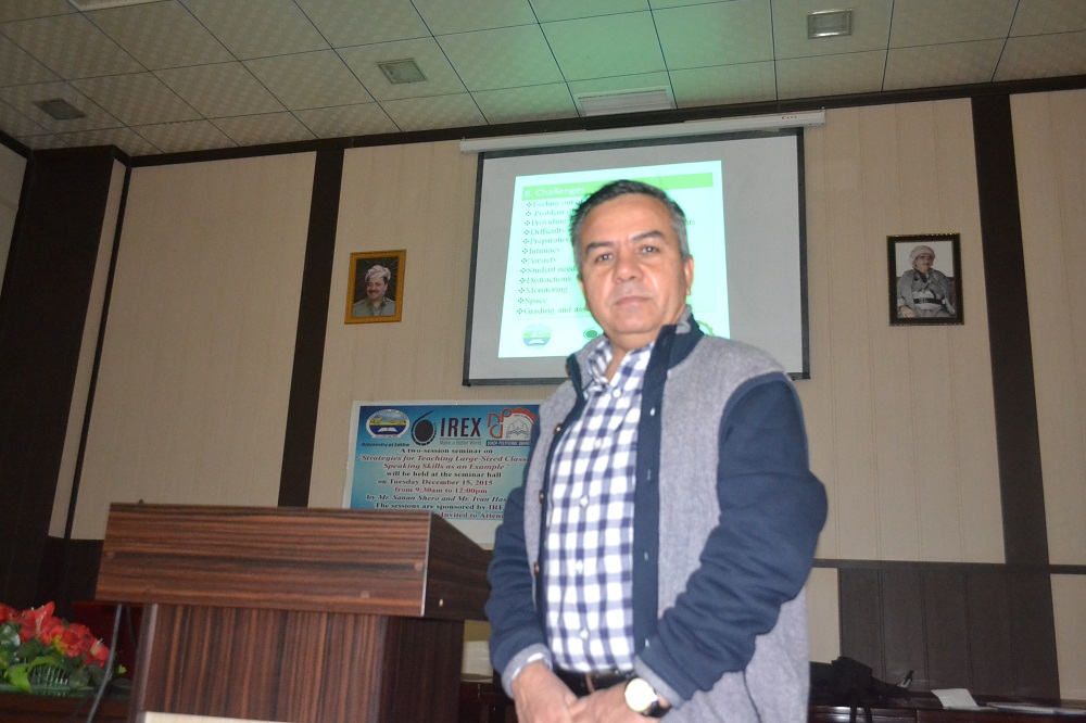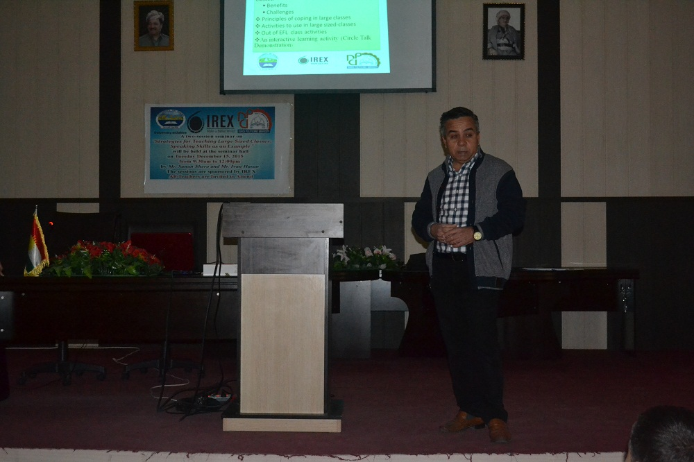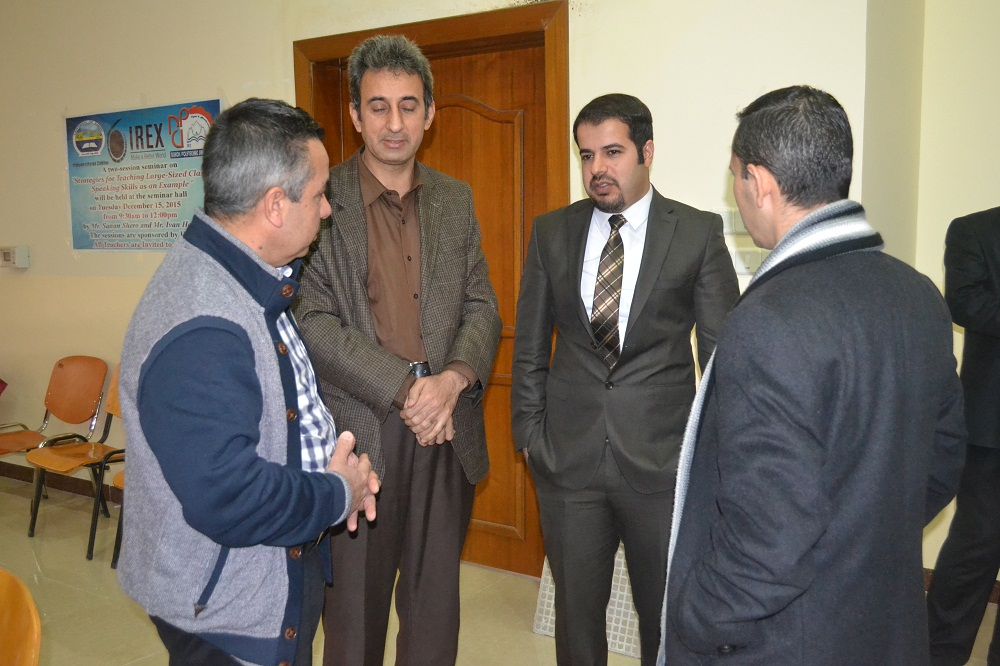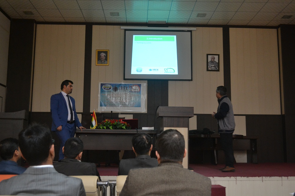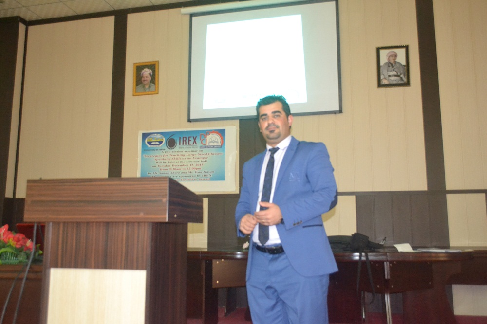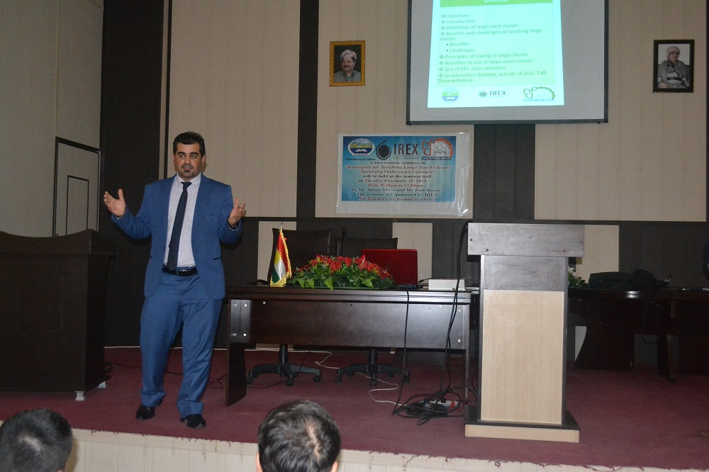 Sponsored by IREX and in collaboration between the University of Zakho and the Duhok Polytechnic University, a two-session seminar entitled Strategies for Teaching Large- Sized Classes: Speaking Skills as an Example was presented by two lecturers from the Department of English Language at the University of Zakho, namely Mr. Sanan Shero Malo Zebari and Mr. Ivan Hasan Murad at the Seminar Hall of the Duhok Administrative Technical Institute at the Duhok Polytechnic University.