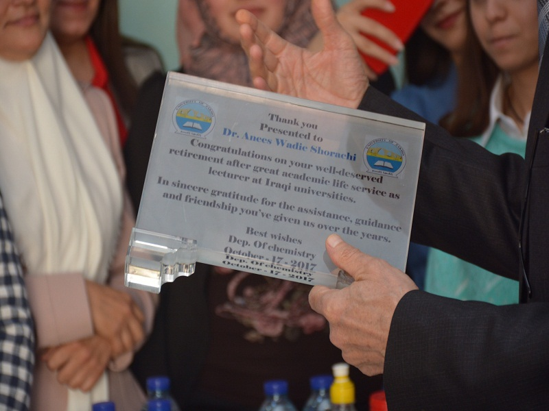 On Monday, October 29, 2018, Head of the Chemistry Department organized a farewell party to honor Dr. Anis Wadie Shurji – a lecturer from the Department of Chemistry in the presence of Assistant Professor Dr. Lazgin A. Jamil-President of the University of Zakho and Dr. Maher Kh. Ali-Dean of the Faculty of Science and Faculty Members of the Department. The purpose of this party was to acknowledge his role in the process of education. In this ceremony, he was awarded by two awards from the President of the University and Dean of the Faculty of Science.