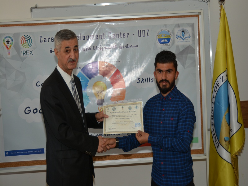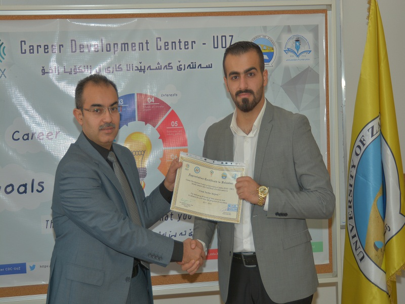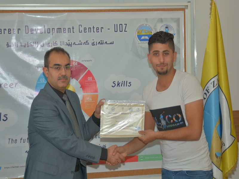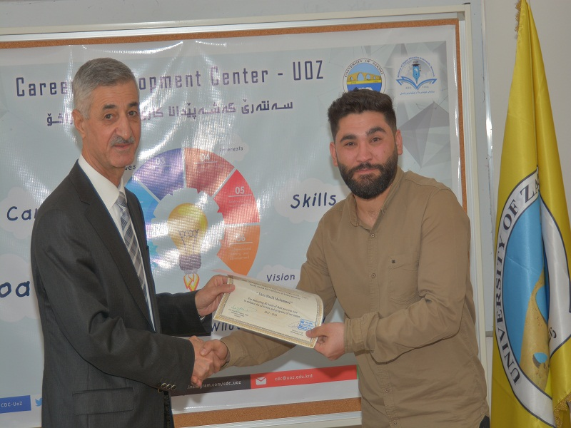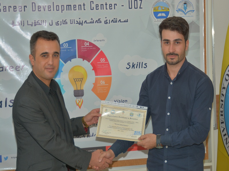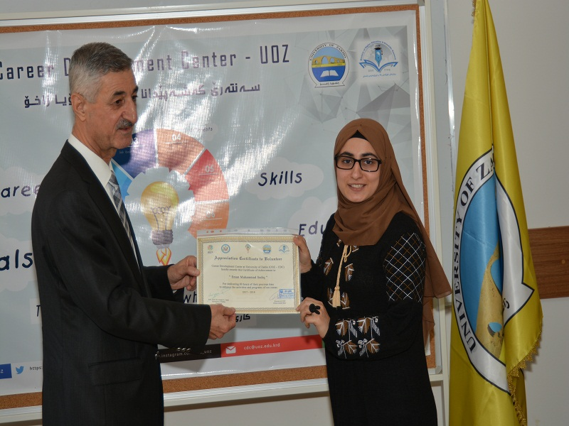 On Tuesday, October 10, 2018, in the presence of Assistant Professor Dr. Lazgin A. Jameel-President of the University of Zakho, Assistant Professor Dr. Yaseen T. Mustafa-Vice President of the University for Scientific Affairs and Postgraduate Studies, Ms. Dileen A. Meero-Director of Career Development Center, and lecturers of the University, the ceremony of distributing certificates to students who volunteered with the center, was held.