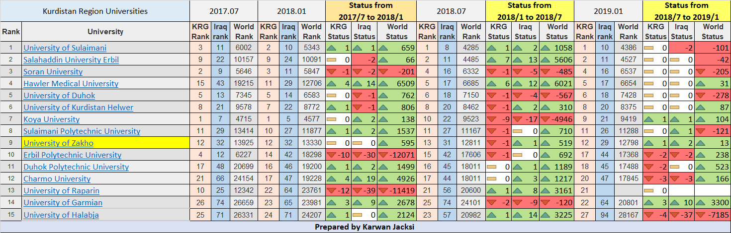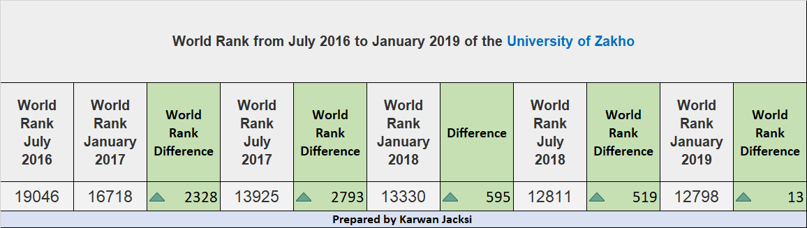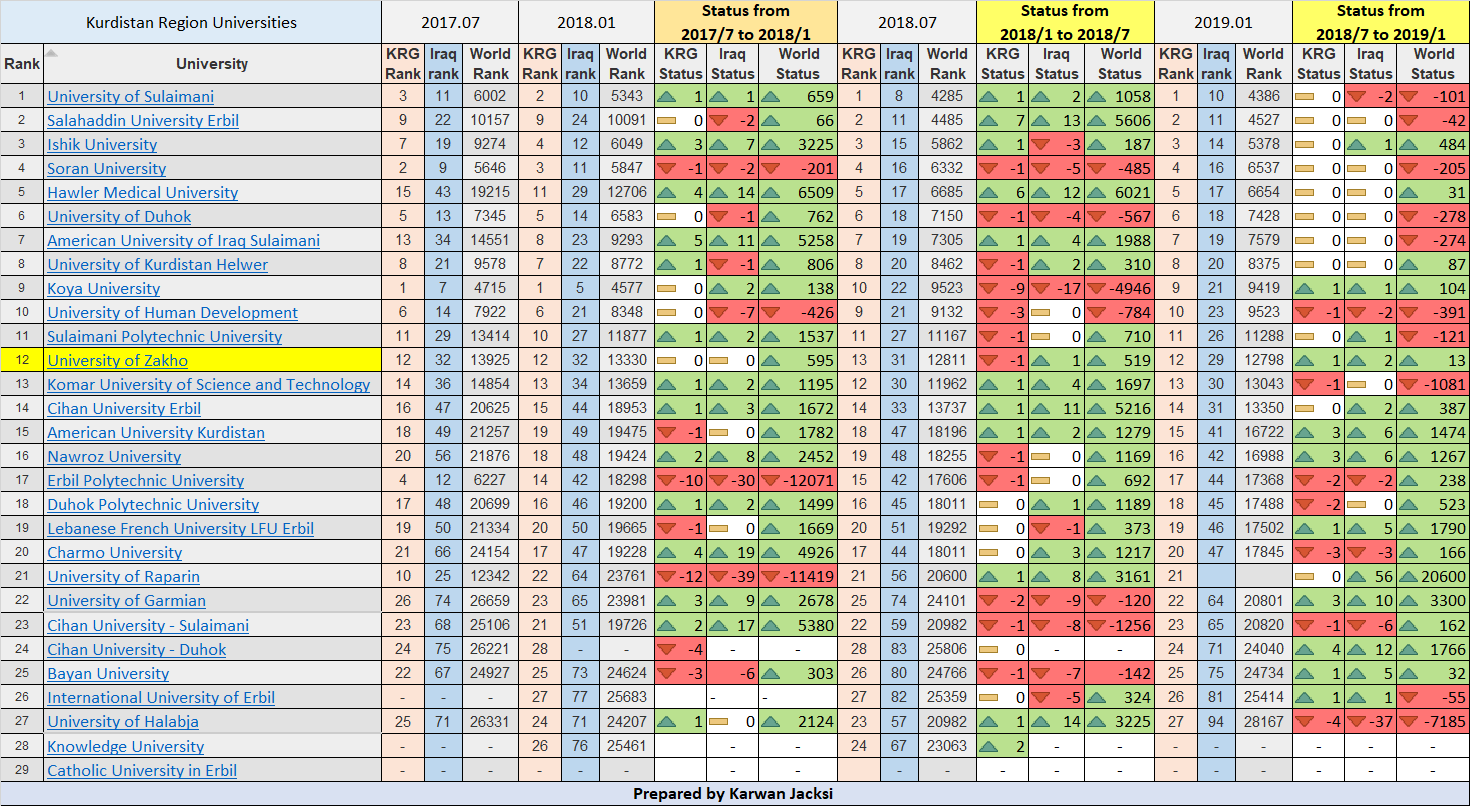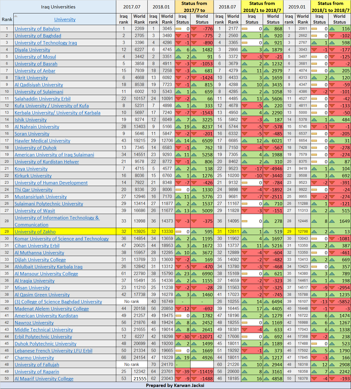The Ranking Web of Universities (Webometrics) has published a new list for the ranking of the universities in January 2019. The new list published by the site shows remarkable progress in the University of Zakho, where it has made progress in the ranking at the global and regional level, ranking 29th on the level of Iraq after it was ranked 31 according to the previous list published in July last year. It is worth mentioning that "The Webometrics University Ranking is a ranking system based on university web presence, visibility, and web access. This ranking system measures how strongly a university is present in the web by its own web domain, sub-pages, rich files, scholarly articles etc.". To see the statics and ranking of universities, click on the following images: