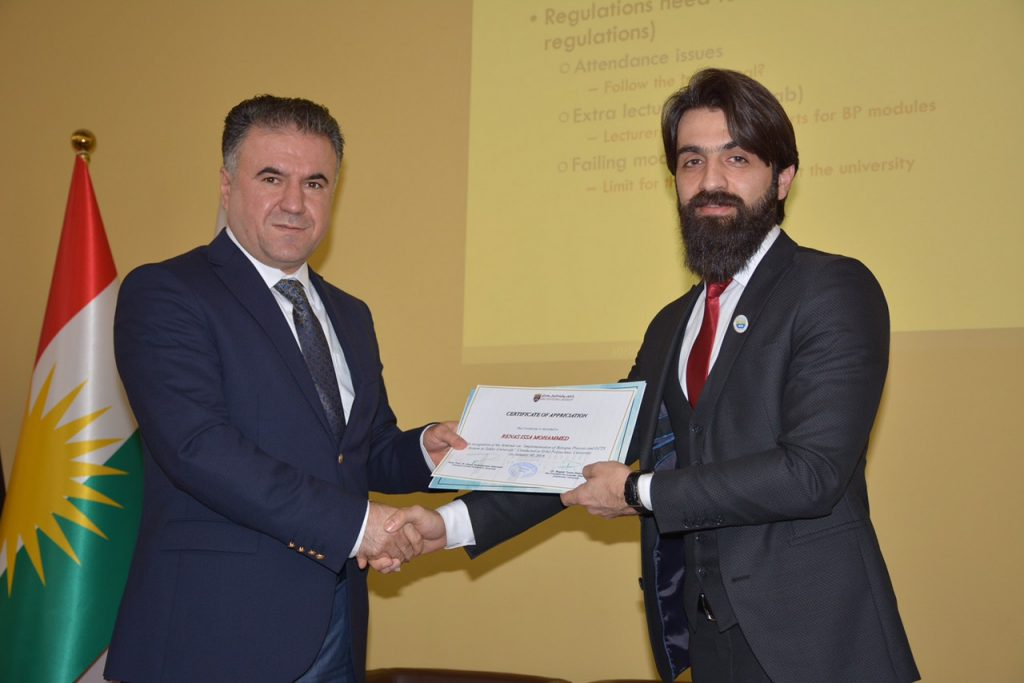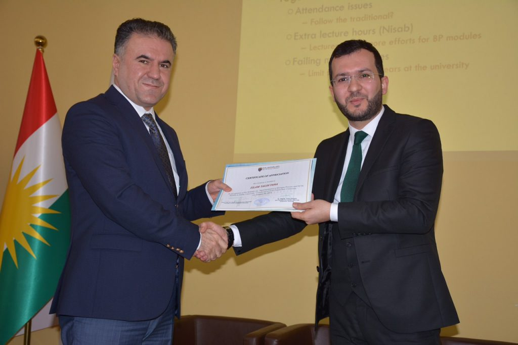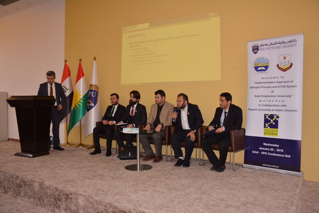 On Wednesday, January 30, 2019, in the presence of Assistant Professor Dr. Kawa Sherwani- President of Erbil Polytechnic University, and representatives of the University of Zakho and Raparen University, a workshop on Bologna process was held at the hall of conference-Erbil Polytechnic University. At the beginning of the workshop, the President of Erbil Polytechnic University delivered a speech and welcomed the guests and attendees. Then he talked about the importance of the Bologna process in the progress of Kurdistan universities. Then the panels and sessions of the workshop started. It is worth mentioning that Mr. Islam Salih and Mr. Renas Essa presented a seminar on the "Implementation of Bologna Process in Erbil Polytechnic University".
